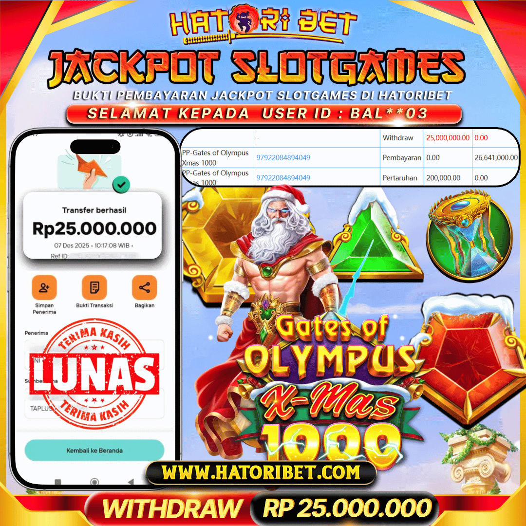Selamat kepada UserId : TUK****** telah berhasil mendapatkan kemenangan besar pada permainan SLOTGAMES PP-GATES OF OLYMPUS 1000 RP 25,000,000 , Setelah mengisi formulir withdraw dalam kurung waktu hanya 5 – 10 menit pihak HatoriBet sudah melakukan transfer kepada pemilik UserId dan dana sudah dapat di cairkan oleh pemenang. Bukti pembayaran yang kami berikan merupakan bukti pembayaran yang SAH / VALID yang langsung di dapatkan melaui tanda transfer transaksi dari Bank yang di tuju. Kami mengucapakan banyak Terima Kasih Kepada pemenang karena sudah mempercayakan kami sebagai Bandar terpercaya yang membayar semua kemenangan member hingga lunas. Masih ragu dengan HatoriBet? Di mana bandar slot dan togel online sekarang yang terpercaya seperti hatoribet ? Bandar yang mengirimkan kemenangan member tanpa bertele – tele. Jadi.... tidak perlu khawatir pada situs HATORIBET karena kemenangan berapapun akan dibayarkan hingga lunas kepada pemenang.