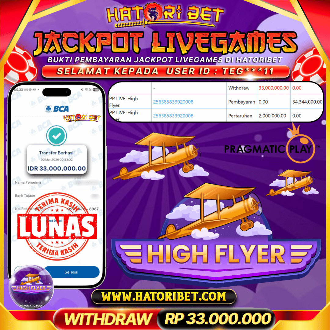 Selamat kepada UserId : IR****3 telah berhasil mendapatkan kemenangan besar pada permainan LIVEGAMES PP LIVE SPEED BACCARAT sebesar RP 40,500,000, Setelah mengisi formulir withdraw dalam kurung waktu hanya 5 – 10 menit pihak HatoriBet sudah melakukan transfer kepada pemilik UserId dan dana sudah dapat di cairkan oleh pemenang. Bukti pembayaran yang kami berikan merupakan bukti pembayaran yang SAH / VALID yang langsung di dapatkan melaui tanda transfer transaksi dari Bank yang di tuju. Kami mengucapakan banyak Terima Kasih Kepada pemenang karena sudah mempercayakan kami sebagai Bandar terpercaya yang membayar semua kemenangan member hingga lunas. Masih ragu dengan HatoriBet? Di mana bandar slot dan togel online sekarang yang terpercaya seperti hatoribet ? Bandar yang mengirimkan kemenangan member tanpa bertele – tele. Jadi.... tidak perlu khawatir pada situs HATORIBET karena kemenangan berapapun akan dibayarkan hingga lunas kepada pemenang.