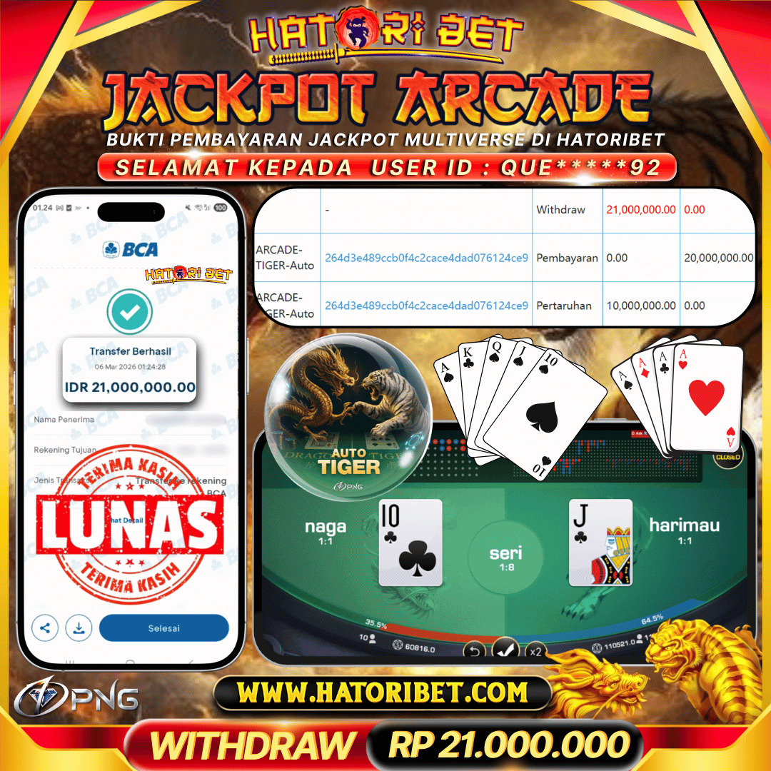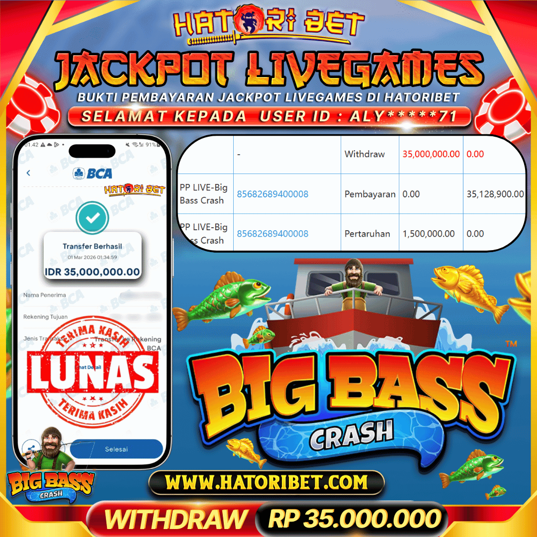 Selamat kepada UserId : LA*****11 telah berhasil mendapatkan kemenangan besar pada permainan LIVEGAMES PP LIVE-LIVE CASINO GAME MONEY TIME sebesar RP 25,000,000, Setelah mengisi formulir withdraw dalam kurung waktu hanya 5 – 10 menit pihak HatoriBet sudah melakukan transfer kepada pemilik UserId dan dana sudah dapat di cairkan oleh pemenang. Bukti pembayaran yang kami berikan merupakan bukti pembayaran yang SAH / VALID yang langsung di dapatkan melaui tanda transfer transaksi dari Bank yang di tuju. Kami mengucapakan banyak Terima Kasih Kepada pemenang karena sudah mempercayakan kami sebagai Bandar terpercaya yang membayar semua kemenangan member hingga lunas. Masih ragu dengan HatoriBet? Di mana bandar slot dan togel online sekarang yang terpercaya seperti hatoribet ? Bandar yang mengirimkan kemenangan member tanpa bertele – tele. Jadi.... tidak perlu khawatir pada situs HATORIBET karena kemenangan berapapun akan dibayarkan hingga lunas kepada pemenang.