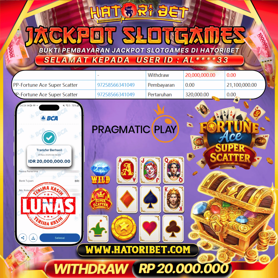 Selamat kepada UserId : BA***890 telah berhasil mendapatkan kemenangan besar pada permainan SLOTGAMES PG-STARLIGHT PRINCESS SUPER SCATTER sebesar RP 20,000,000 , Setelah mengisi formulir withdraw dalam kurung waktu hanya 5 – 10 menit pihak HatoriBet sudah melakukan transfer kepada pemilik UserId dan dana sudah dapat di cairkan oleh pemenang. Bukti pembayaran yang kami berikan merupakan bukti pembayaran yang SAH / VALID yang langsung di dapatkan melaui tanda transfer transaksi dari Bank yang di tuju. Kami mengucapakan banyak Terima Kasih Kepada pemenang karena sudah mempercayakan kami sebagai Bandar terpercaya yang membayar semua kemenangan member hingga lunas. Masih ragu dengan HatoriBet? Di mana bandar slot dan togel online sekarang yang terpercaya seperti hatoribet ? Bandar yang mengirimkan kemenangan member tanpa bertele – tele. Jadi.... tidak perlu khawatir pada situs HATORIBET karena kemenangan berapapun akan dibayarkan hingga lunas kepada pemenang.