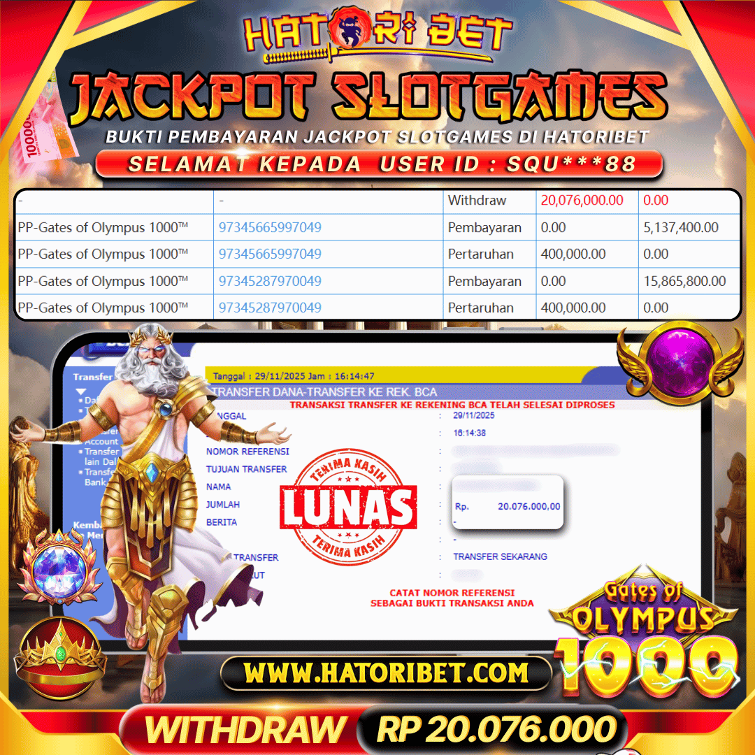Selamat kepada UserId : KW*****99 telah berhasil mendapatkan kemenangan besar pada permainan SLOTGAMES PG-GATES OF OLYMPUS 1000 sebesar RP 20,402,000 , Setelah mengisi formulir withdraw dalam kurung waktu hanya 5 – 10 menit pihak HatoriBet sudah melakukan transfer kepada pemilik UserId dan dana sudah dapat di cairkan oleh pemenang. Bukti pembayaran yang kami berikan merupakan bukti pembayaran yang SAH / VALID yang langsung di dapatkan melaui tanda transfer transaksi dari Bank yang di tuju. Kami mengucapakan banyak Terima Kasih Kepada pemenang karena sudah mempercayakan kami sebagai Bandar terpercaya yang membayar semua kemenangan member hingga lunas. Masih ragu dengan HatoriBet? Di mana bandar slot dan togel online sekarang yang terpercaya seperti hatoribet ? Bandar yang mengirimkan kemenangan member tanpa bertele – tele. Jadi.... tidak perlu khawatir pada situs HATORIBET karena kemenangan berapapun akan dibayarkan hingga lunas kepada pemenang.
