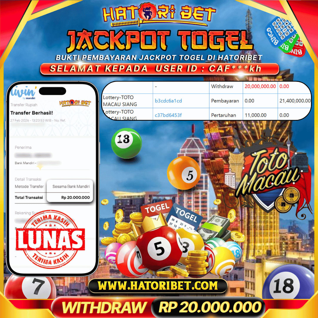 HATORIBET JACKPOT TOGEL TOTO MACAU RP 20,000,000 ,- LUNAS