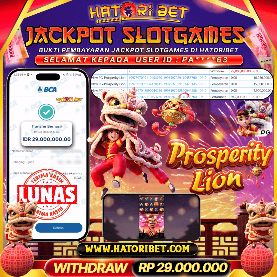 Selamat kepada UserId : KUT***** telah berhasil mendapatkan kemenangan besar pada permainan SLOTGAMES PP-DUEL OF NIGHT & DAY RP 20,000,000 , Setelah mengisi formulir withdraw dalam kurung waktu hanya 5 – 10 menit pihak HatoriBet sudah melakukan transfer kepada pemilik UserId dan dana sudah dapat di cairkan oleh pemenang. Bukti pembayaran yang kami berikan merupakan bukti pembayaran yang SAH / VALID yang langsung di dapatkan melaui tanda transfer transaksi dari Bank yang di tuju. Kami mengucapakan banyak Terima Kasih Kepada pemenang karena sudah mempercayakan kami sebagai Bandar terpercaya yang membayar semua kemenangan member hingga lunas. Masih ragu dengan HatoriBet? Di mana bandar slot dan togel online sekarang yang terpercaya seperti hatoribet ? Bandar yang mengirimkan kemenangan member tanpa bertele – tele. Jadi.... tidak perlu khawatir pada situs HATORIBET karena kemenangan berapapun akan dibayarkan hingga lunas kepada pemenang.