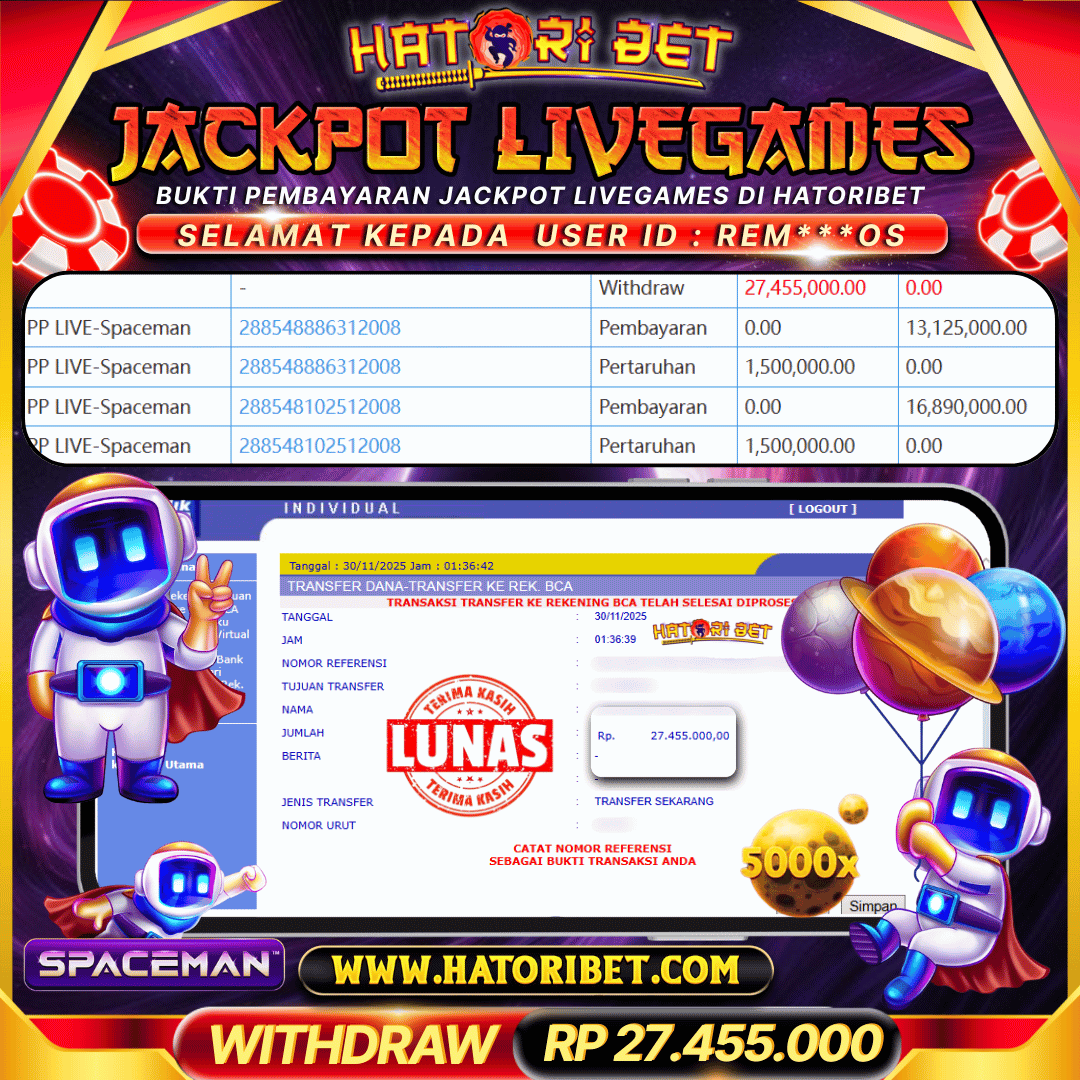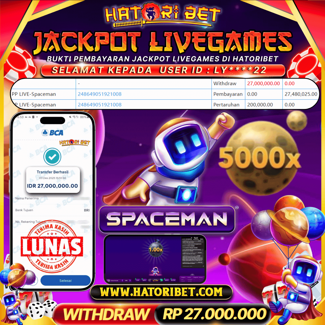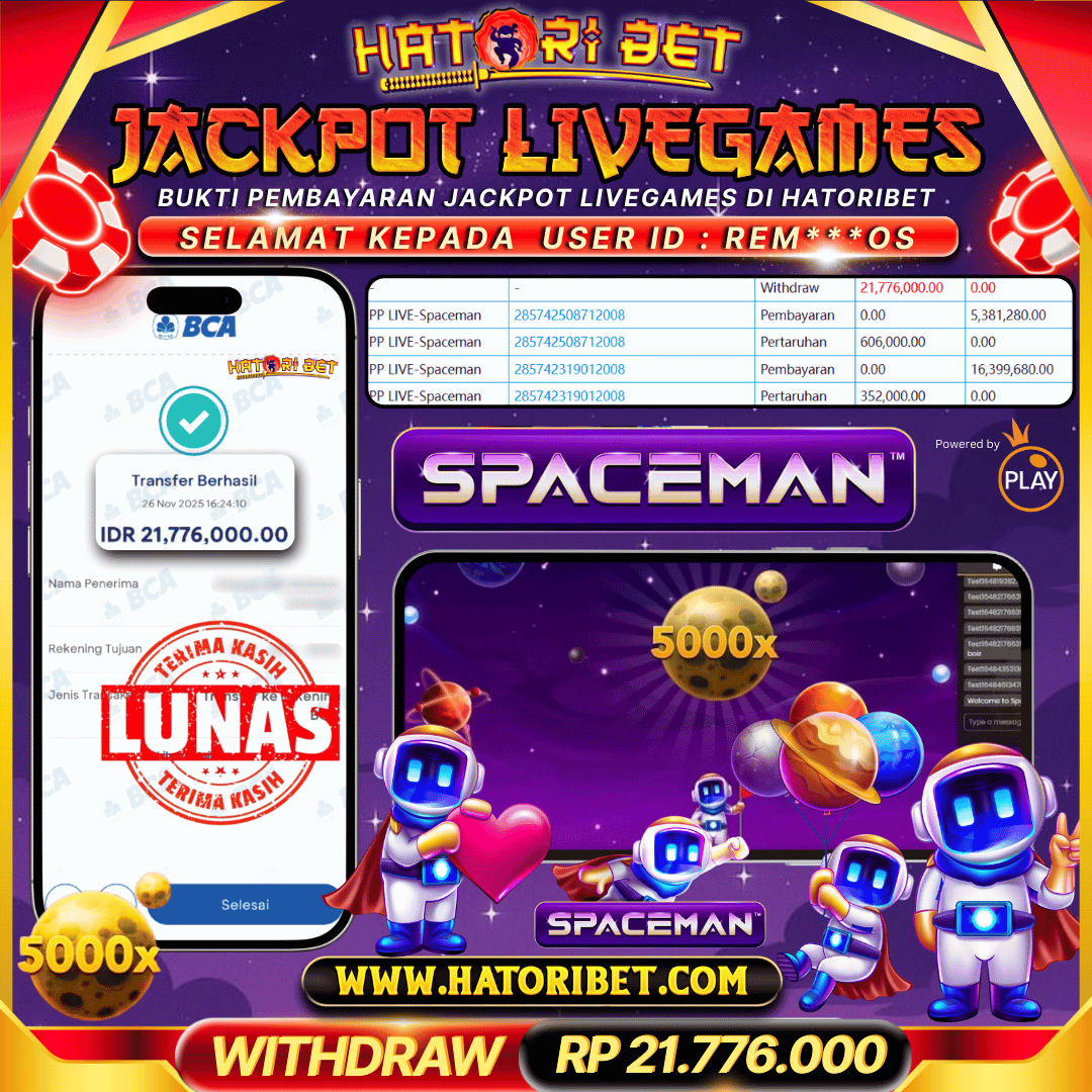 HATORIBET JACKPOT LIVEGAMES PP LIVE-SPACEMAN RP 25,000,000 ,- LUNAS