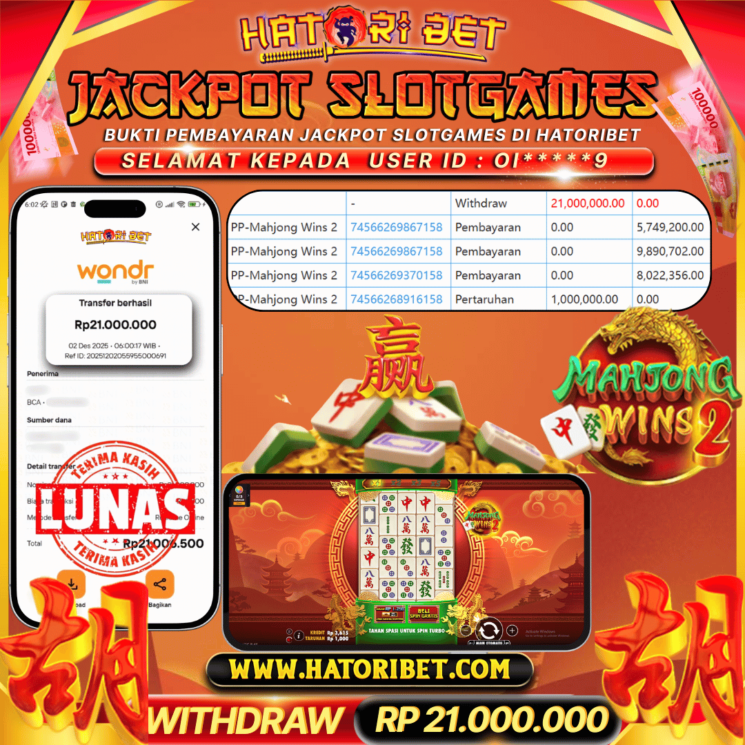 Selamat kepada UserId : WAL*** telah berhasil mendapatkan kemenangan besar pada permainan SLOTGAMES PG-MAHJONG WAYS RP 22,000,000 , Setelah mengisi formulir withdraw dalam kurung waktu hanya 5 – 10 menit pihak HatoriBet sudah melakukan transfer kepada pemilik UserId dan dana sudah dapat di cairkan oleh pemenang. Bukti pembayaran yang kami berikan merupakan bukti pembayaran yang SAH / VALID yang langsung di dapatkan melaui tanda transfer transaksi dari Bank yang di tuju. Kami mengucapakan banyak Terima Kasih Kepada pemenang karena sudah mempercayakan kami sebagai Bandar terpercaya yang membayar semua kemenangan member hingga lunas. Masih ragu dengan HatoriBet? Di mana bandar slot dan togel online sekarang yang terpercaya seperti hatoribet ? Bandar yang mengirimkan kemenangan member tanpa bertele – tele. Jadi.... tidak perlu khawatir pada situs HATORIBET karena kemenangan berapapun akan dibayarkan hingga lunas kepada pemenang.