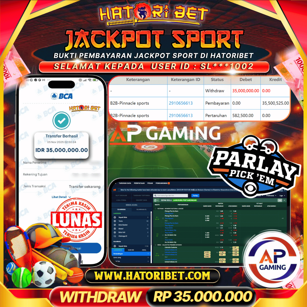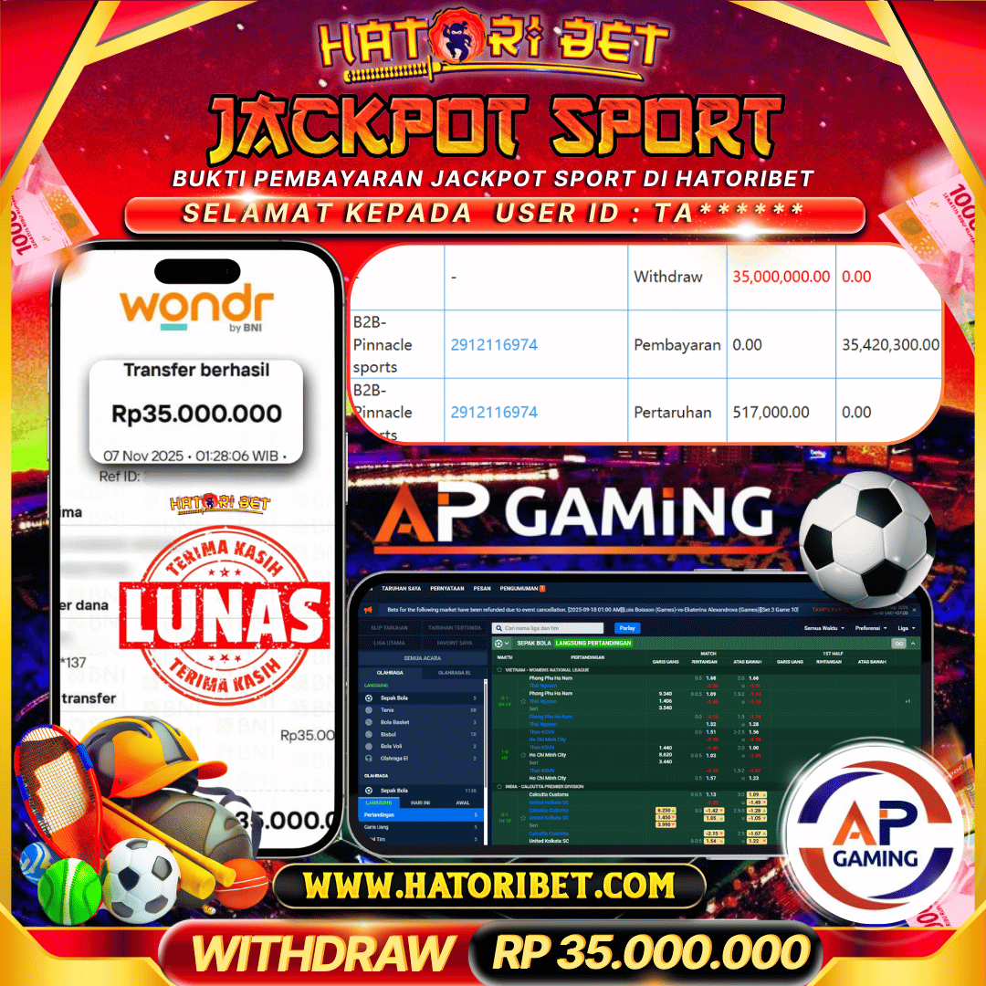 HATORIBET JACKPOT SPORT AP GAMING RP 35,000,000 ,- LUNAS