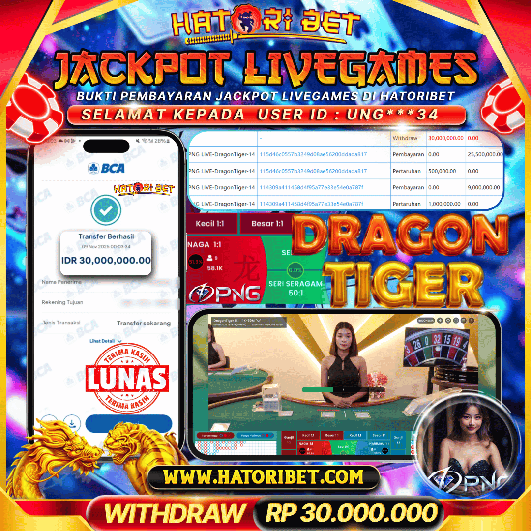 HATORIBET JACKPOT LIVEGAMES PNG LIVE-DRAGON TIGER 14 RP 30,000,000 ,- LUNAS