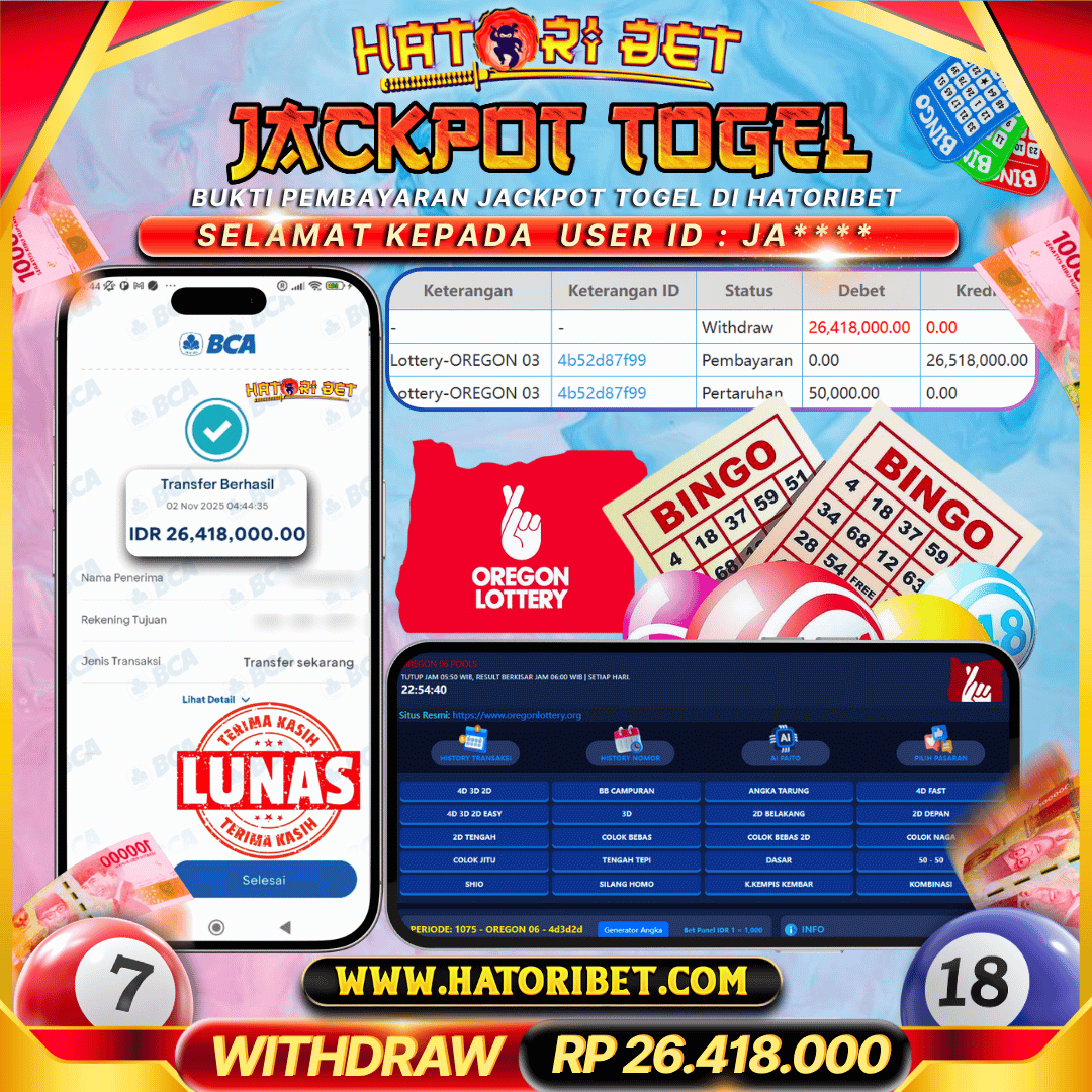 HATORIBET JACKPOT TOGEL OREGON 06 RP 26,418,000 ,- LUNAS