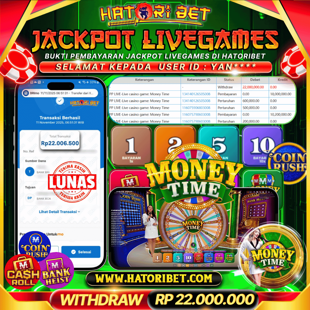 HATORIBET JACKPOT LIVEGAMES PP LIVE-MONEY TIME RP 22,000,000 ,- LUNAS