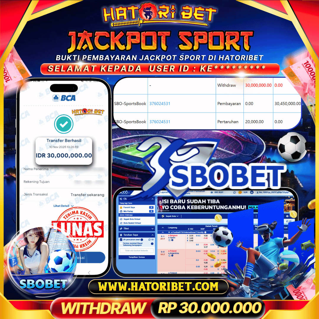 HATORIBET JACKPOT SPORT SBOBET RP 30,000,000 ,- LUNAS