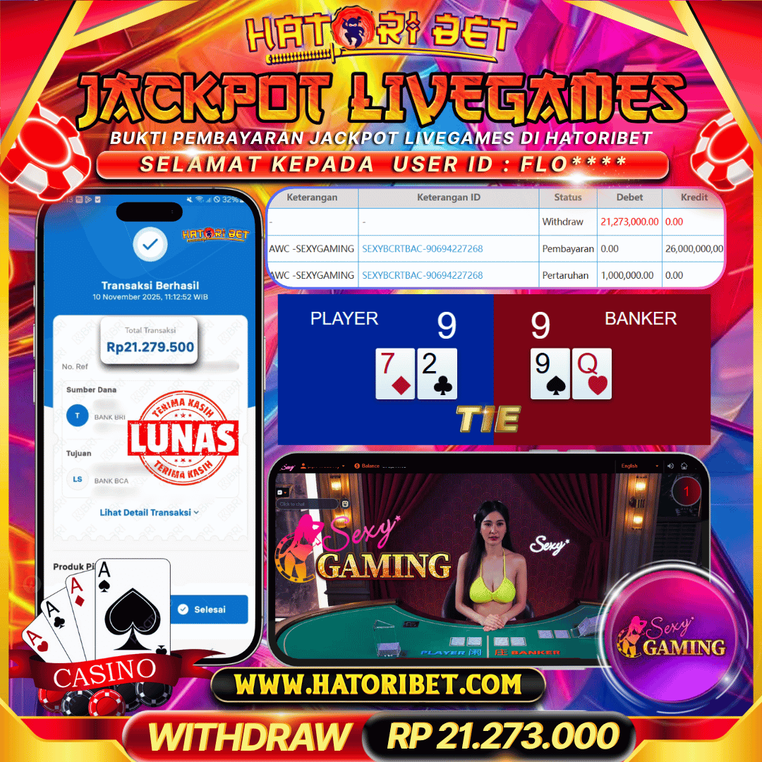 HATORIBET JACKPOT LIVEGAMES SEXY GAMING-BACCARAT C02 RP 21,273,000 ,- LUNAS