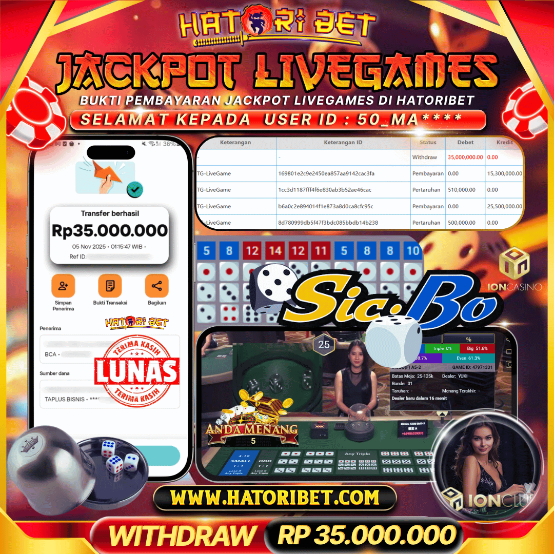 HATORIBET JACKPOT LIVEGAMES TGION LIVE-SIC BO RP 35,000,000 ,- LUNAS