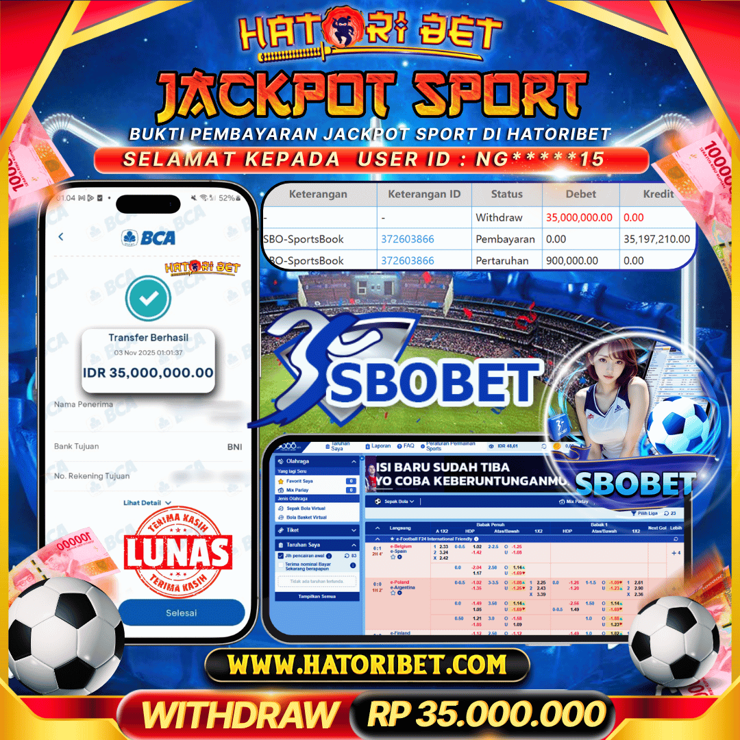 HATORIBET JACKPOT SPORT SBOBET RP 35,000,000 ,- LUNAS
