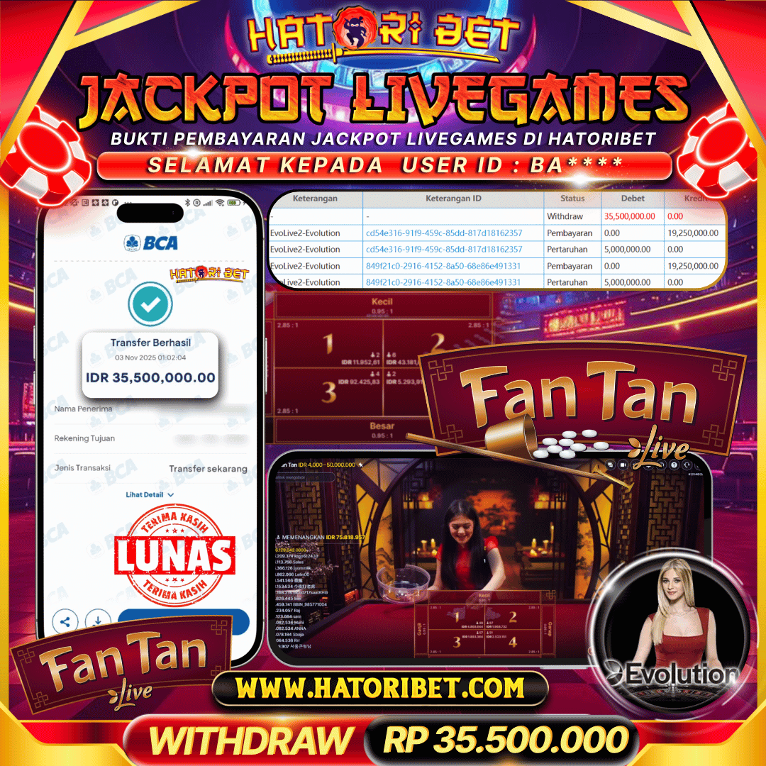 HATORIBET JACKPOT LIVEGAMES EVOLUTION LIVE-FAN TAN LIVE RP 35,500,000 ,- LUNAS