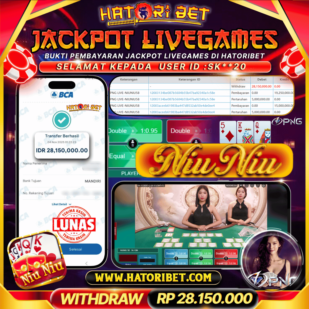 HATORIBET JACKPOT LIVEGAMES PNG LIVE-NIU NIU 58 RP 28,150,000 ,- LUNAS