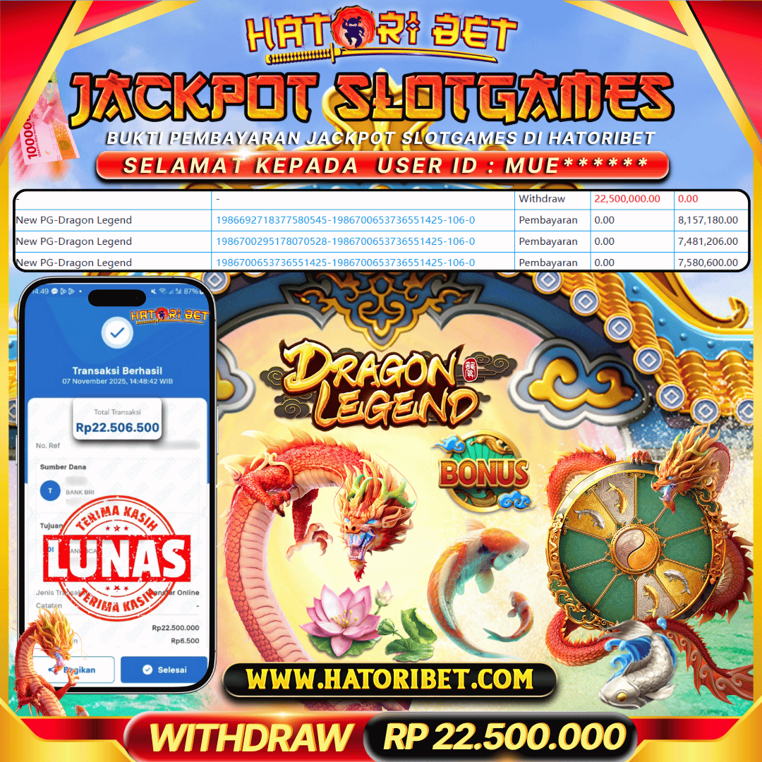 HATORIBET JACKPOT SLOTGAMES PG-DRAGON LEGEND 22,500,000 ,- LUNAS