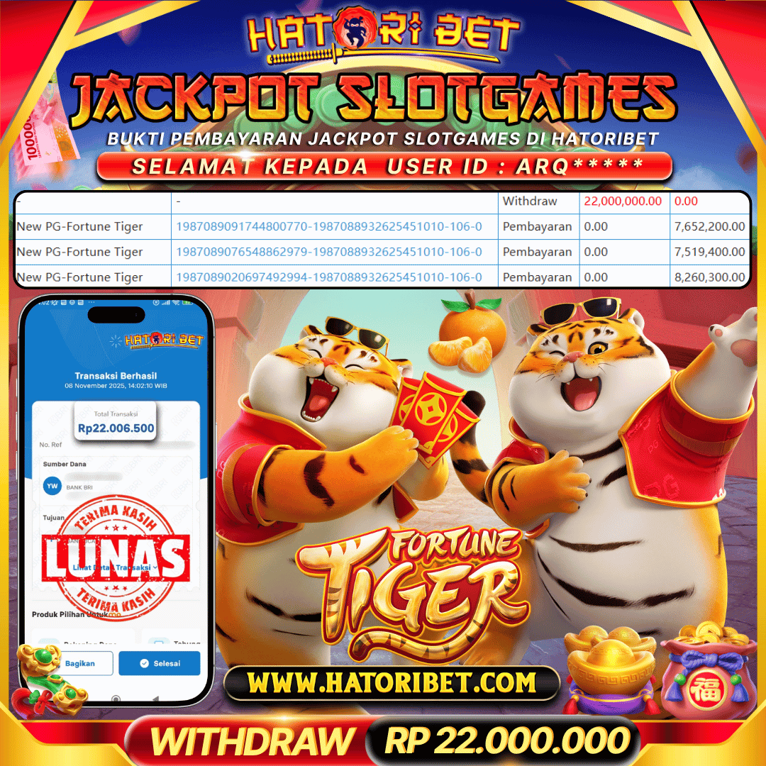 HATORIBET JACKPOT SLOTGAMES PG-FORTUNE TIGER 22,000,000 ,- LUNAS