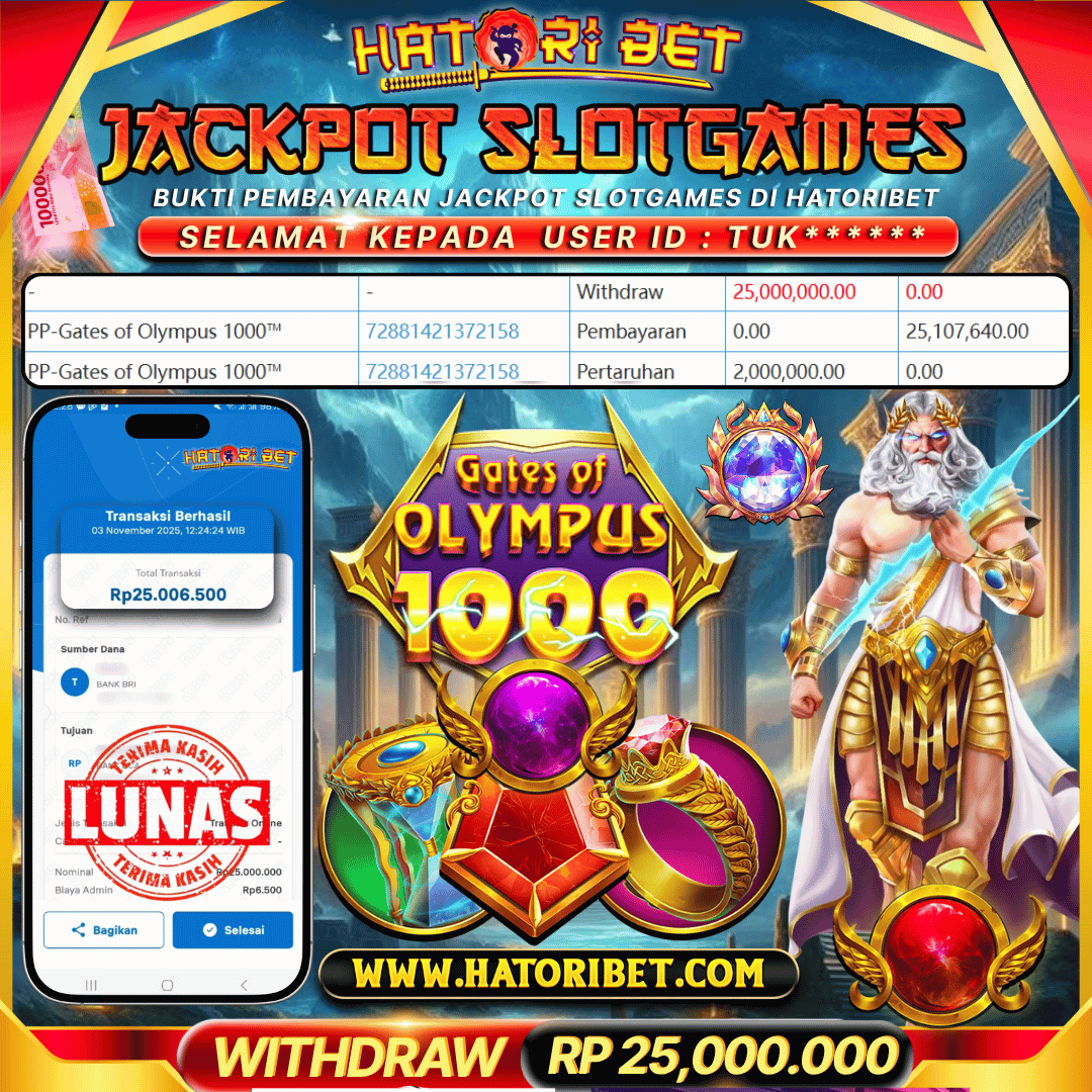 Selamat kepada UserId : TUK****** telah berhasil mendapatkan kemenangan besar pada permainan SLOTGAMES PP-GATES OF OLYMPUS 1000 RP 25,000,000 , Setelah mengisi formulir withdraw dalam kurung waktu hanya 5 – 10 menit pihak HatoriBet sudah melakukan transfer kepada pemilik UserId dan dana sudah dapat di cairkan oleh pemenang. Bukti pembayaran yang kami berikan merupakan bukti pembayaran yang SAH / VALID yang langsung di dapatkan melaui tanda transfer transaksi dari Bank yang di tuju. Kami mengucapakan banyak Terima Kasih Kepada pemenang karena sudah mempercayakan kami sebagai Bandar terpercaya yang membayar semua kemenangan member hingga lunas. Masih ragu dengan HatoriBet? Di mana bandar slot dan togel online sekarang yang terpercaya seperti hatoribet ? Bandar yang mengirimkan kemenangan member tanpa bertele – tele. Jadi.... tidak perlu khawatir pada situs HATORIBET karena kemenangan berapapun akan dibayarkan hingga lunas kepada pemenang.