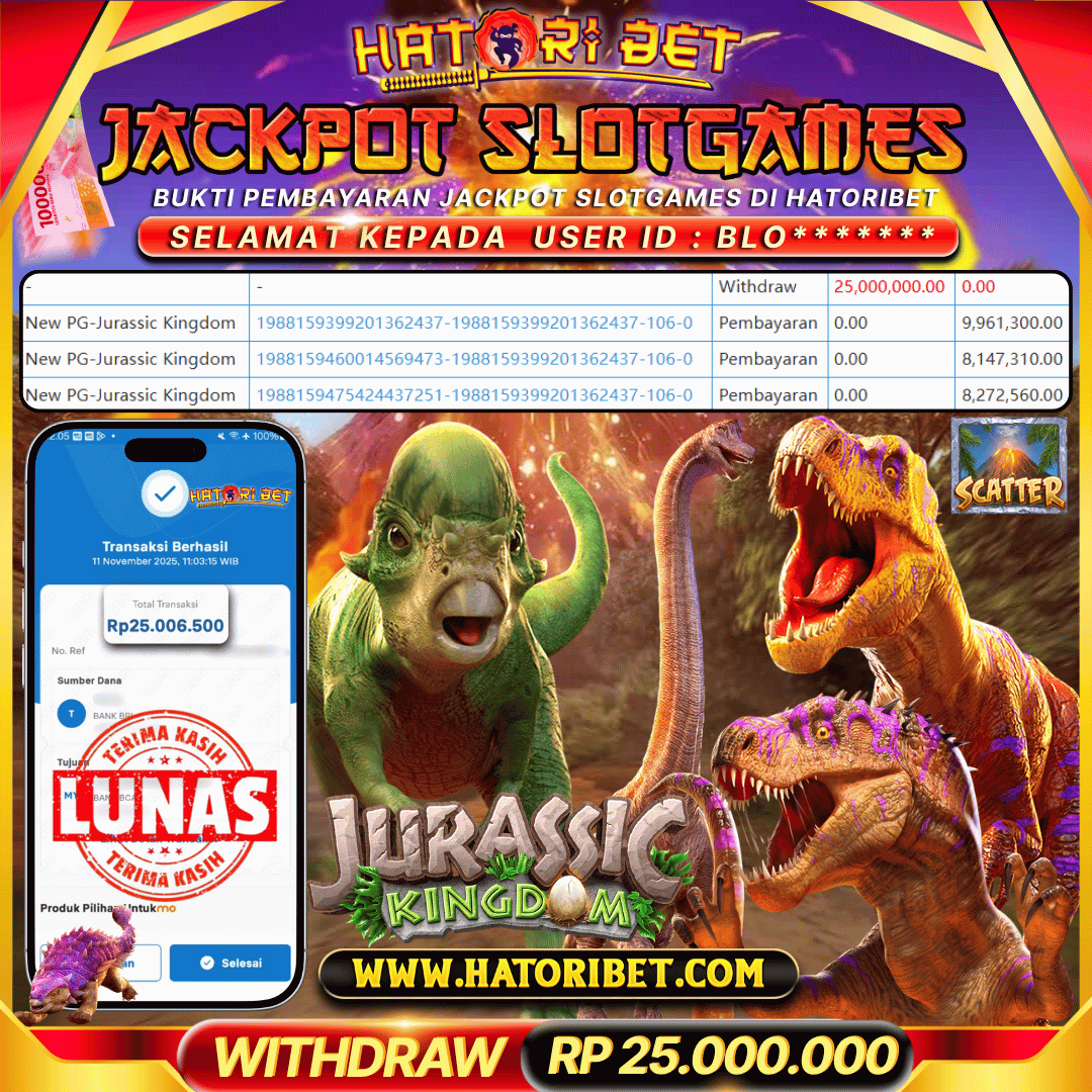 HATORIBET JACKPOT SLOTGAMES PG-JURASSIC KINGDOM 25,000,000 ,- LUNAS