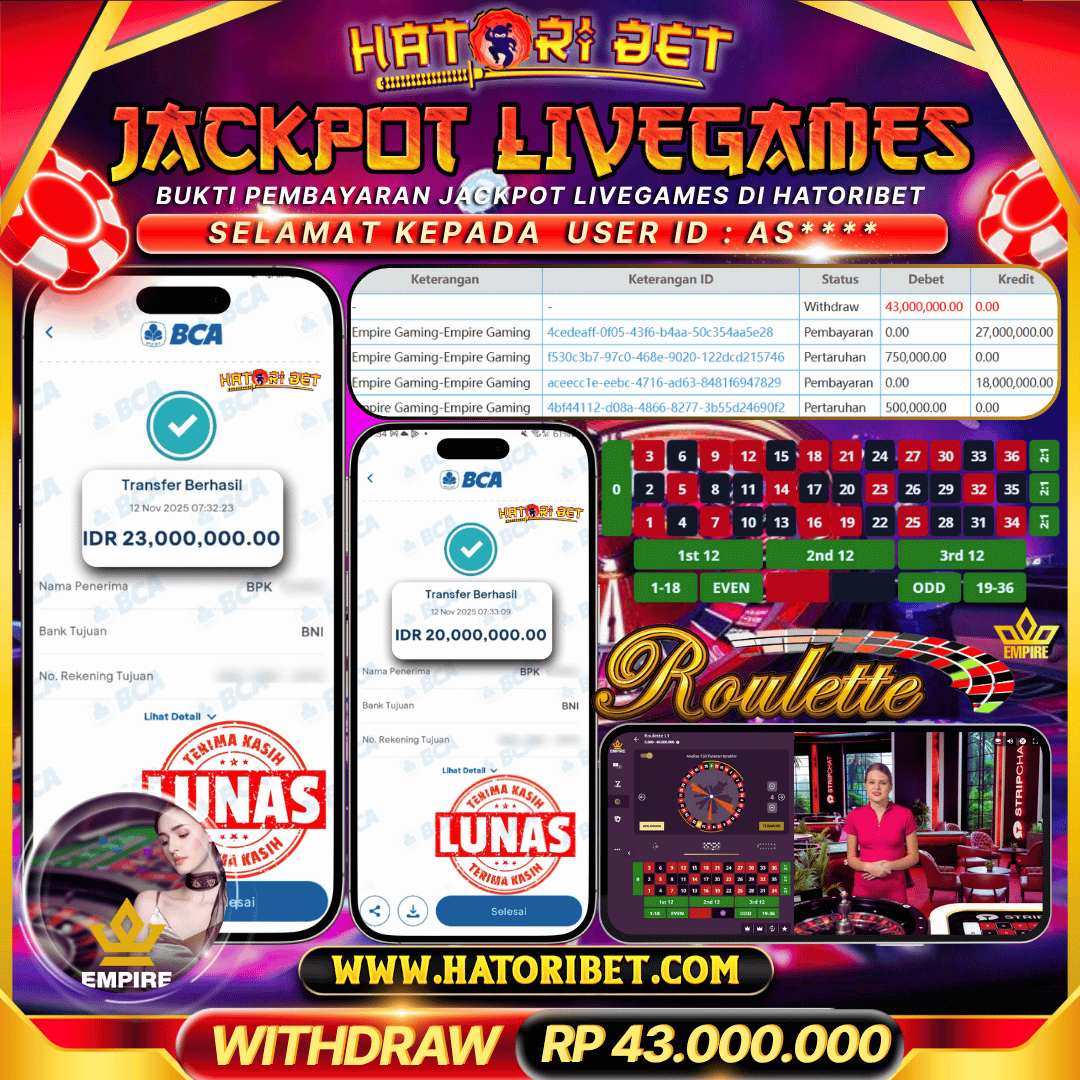 HATORIBET JACKPOT LIVEGAMES EMPIRE GAMING-EUROPEAN ROULETTE RP 43,000,000 ,- LUNAS