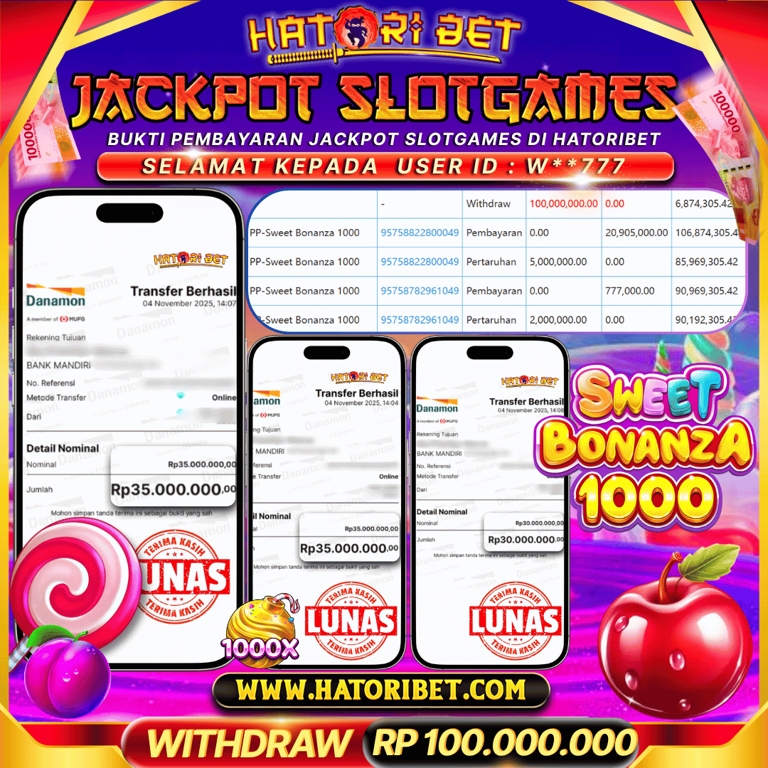 Selamat kepada UserId : W**777 telah berhasil mendapatkan kemenangan besar pada permainan SLOTGAMES PG-SWEET BONANZA 1000 sebesar RP 100,000,000 , Setelah mengisi formulir withdraw dalam kurung waktu hanya 5 – 10 menit pihak HatoriBet sudah melakukan transfer kepada pemilik UserId dan dana sudah dapat di cairkan oleh pemenang. Bukti pembayaran yang kami berikan merupakan bukti pembayaran yang SAH / VALID yang langsung di dapatkan melaui tanda transfer transaksi dari Bank yang di tuju. Kami mengucapakan banyak Terima Kasih Kepada pemenang karena sudah mempercayakan kami sebagai Bandar terpercaya yang membayar semua kemenangan member hingga lunas. Masih ragu dengan HatoriBet? Di mana bandar slot dan togel online sekarang yang terpercaya seperti hatoribet ? Bandar yang mengirimkan kemenangan member tanpa bertele – tele. Jadi.... tidak perlu khawatir pada situs HATORIBET karena kemenangan berapapun akan dibayarkan hingga lunas kepada pemenang.