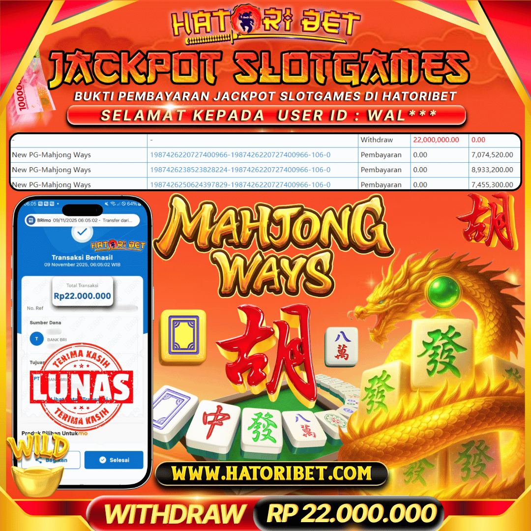 HATORIBET JACKPOT SLOTGAMES PG-MAHJONG WAYS 22,000,000 ,- LUNAS
