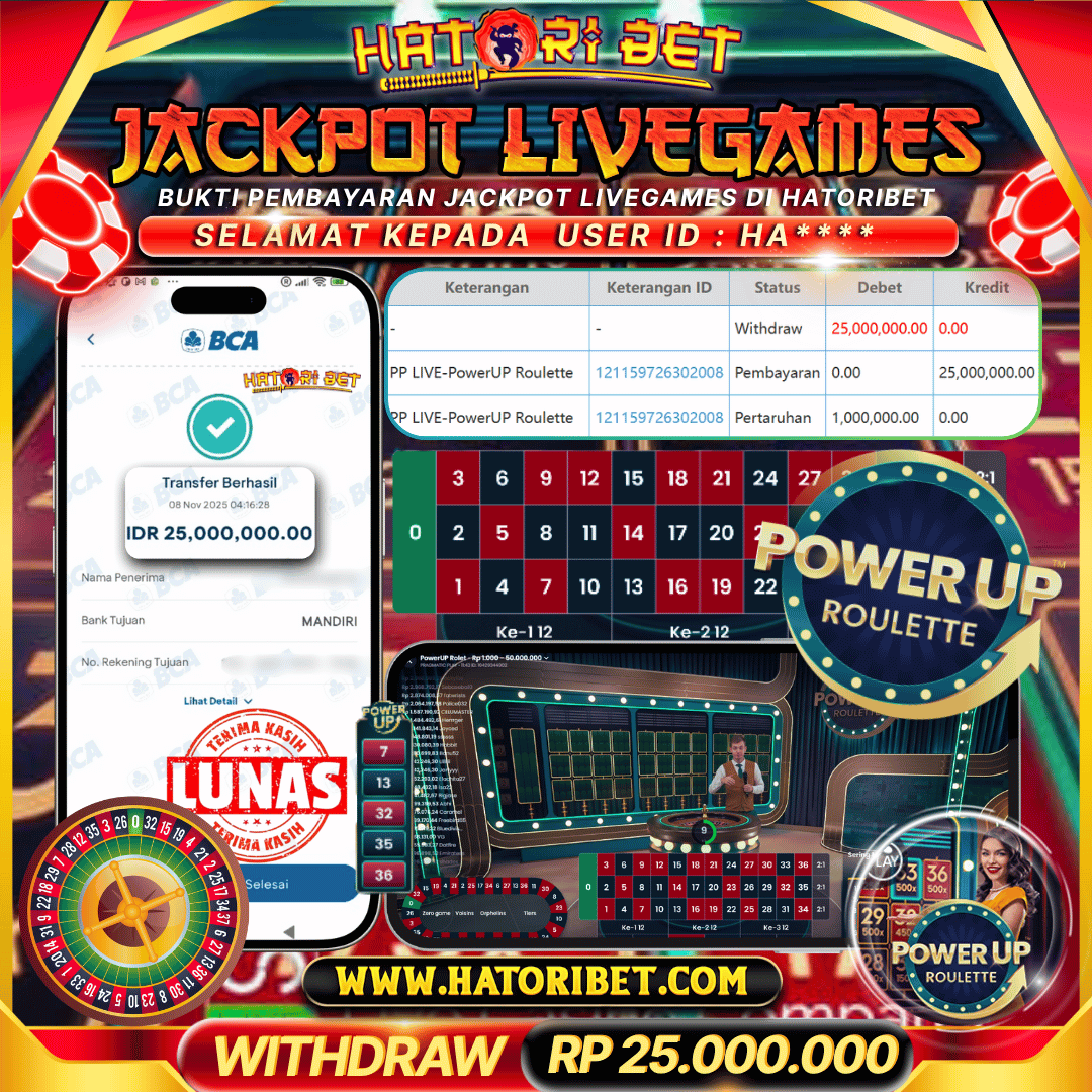 HATORIBET JACKPOT LIVEGAMES PP LIVE-POWERUP ROULETTE RP 25,000,000 ,- LUNAS