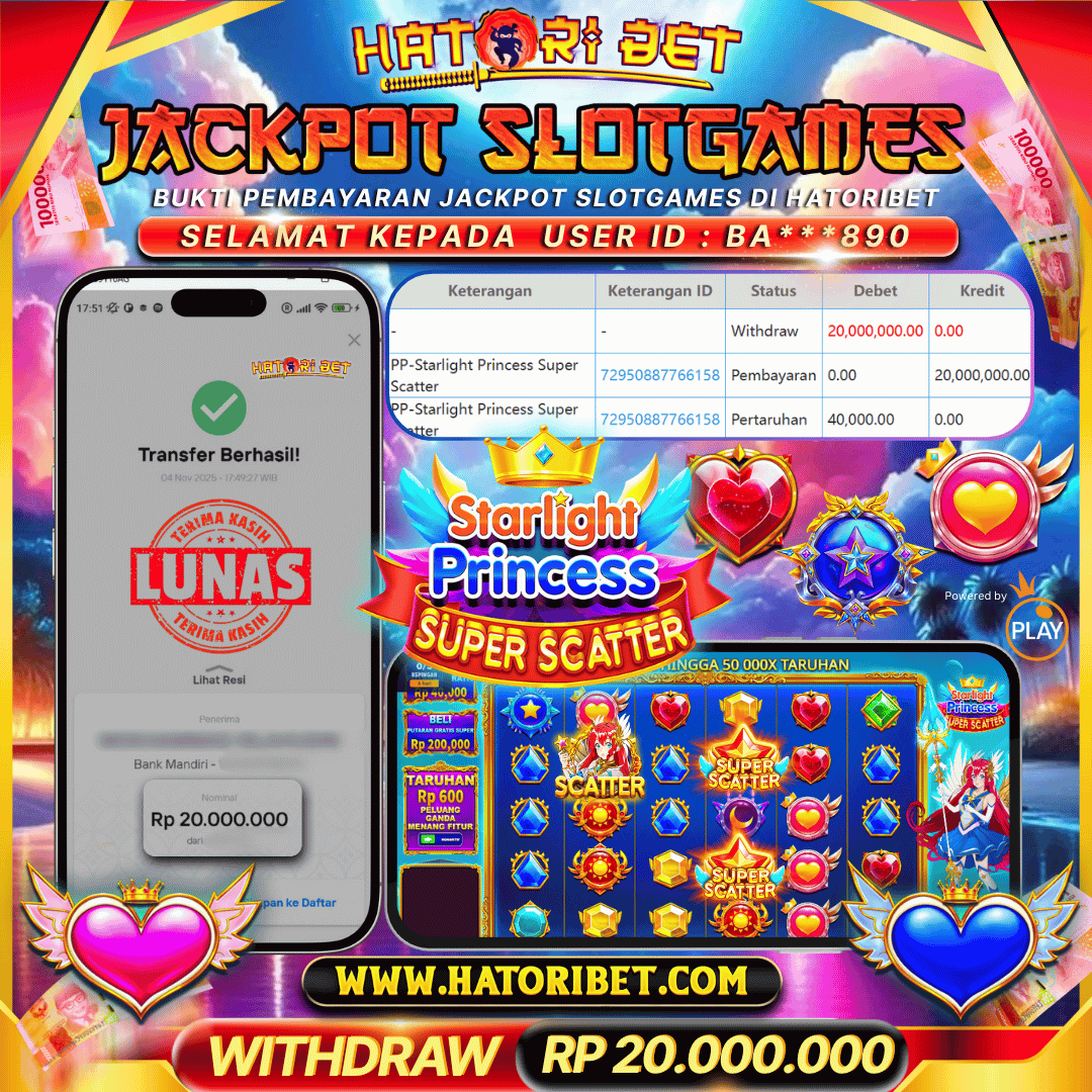Selamat kepada UserId : BA***890 telah berhasil mendapatkan kemenangan besar pada permainan SLOTGAMES PG-STARLIGHT PRINCESS SUPER SCATTER sebesar RP 20,000,000 , Setelah mengisi formulir withdraw dalam kurung waktu hanya 5 – 10 menit pihak HatoriBet sudah melakukan transfer kepada pemilik UserId dan dana sudah dapat di cairkan oleh pemenang. Bukti pembayaran yang kami berikan merupakan bukti pembayaran yang SAH / VALID yang langsung di dapatkan melaui tanda transfer transaksi dari Bank yang di tuju. Kami mengucapakan banyak Terima Kasih Kepada pemenang karena sudah mempercayakan kami sebagai Bandar terpercaya yang membayar semua kemenangan member hingga lunas. Masih ragu dengan HatoriBet? Di mana bandar slot dan togel online sekarang yang terpercaya seperti hatoribet ? Bandar yang mengirimkan kemenangan member tanpa bertele – tele. Jadi.... tidak perlu khawatir pada situs HATORIBET karena kemenangan berapapun akan dibayarkan hingga lunas kepada pemenang.