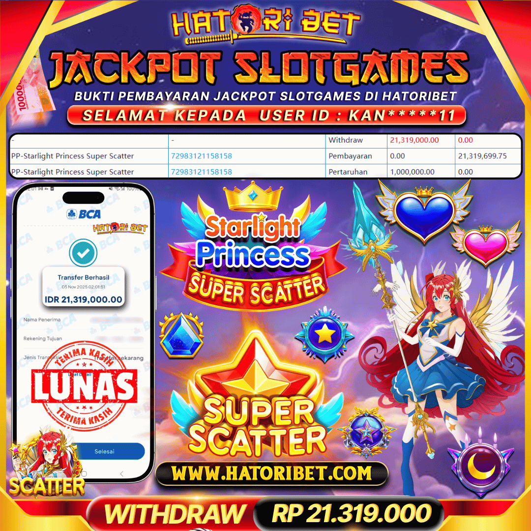 Selamat kepada UserId : KAN*****11 telah berhasil mendapatkan kemenangan besar pada permainan SLOTGAMES PP-STARLIGHT PRINCESS SUPER SCATTER RP 21,319,000 , Setelah mengisi formulir withdraw dalam kurung waktu hanya 5 – 10 menit pihak HatoriBet sudah melakukan transfer kepada pemilik UserId dan dana sudah dapat di cairkan oleh pemenang. Bukti pembayaran yang kami berikan merupakan bukti pembayaran yang SAH / VALID yang langsung di dapatkan melaui tanda transfer transaksi dari Bank yang di tuju. Kami mengucapakan banyak Terima Kasih Kepada pemenang karena sudah mempercayakan kami sebagai Bandar terpercaya yang membayar semua kemenangan member hingga lunas. Masih ragu dengan HatoriBet? Di mana bandar slot dan togel online sekarang yang terpercaya seperti hatoribet ? Bandar yang mengirimkan kemenangan member tanpa bertele – tele. Jadi.... tidak perlu khawatir pada situs HATORIBET karena kemenangan berapapun akan dibayarkan hingga lunas kepada pemenang.