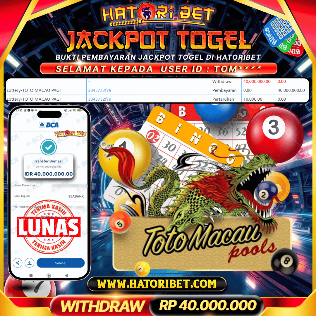 HATORIBET JACKPOT TOGEL TOTO MACAU RP 40,000,000 ,- LUNAS