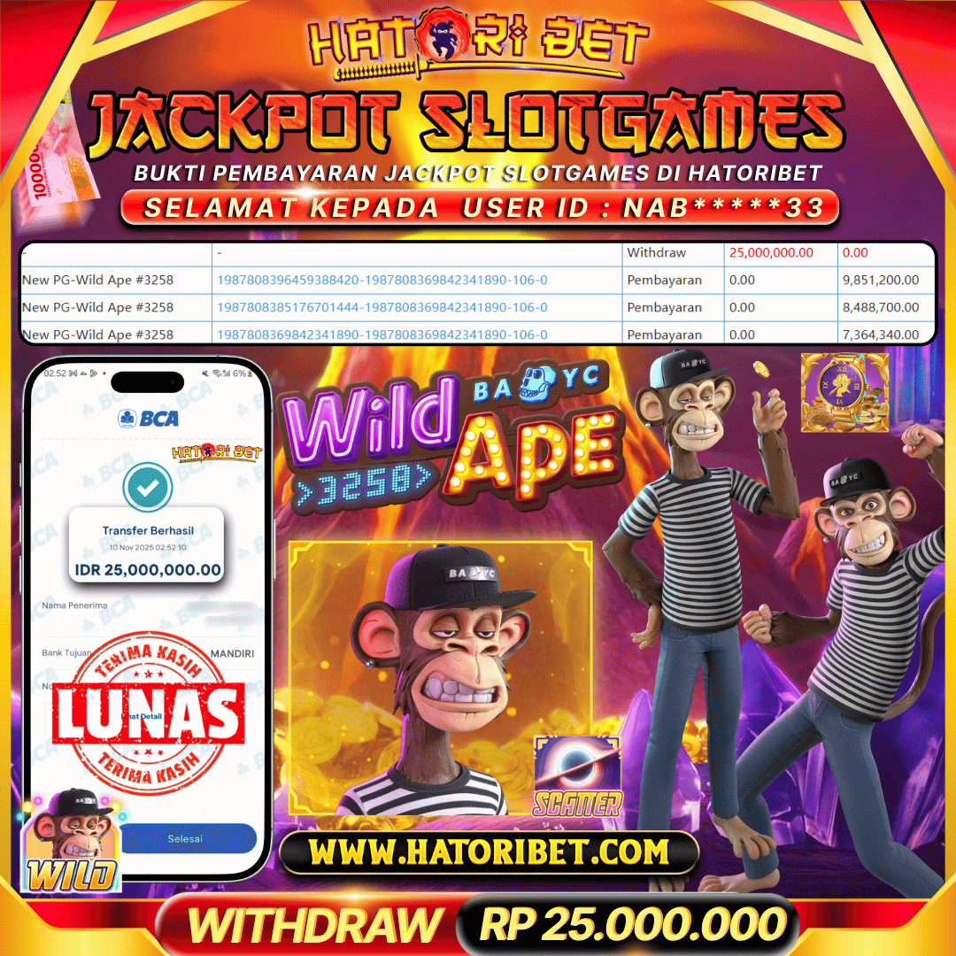 HATORIBET JACKPOT SLOTGAMES PG-WILD APE #3258 25,000,000 ,- LUNAS