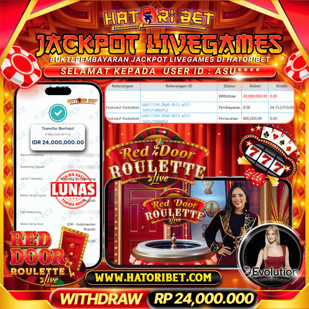 Selamat kepada UserId : BER***** telah berhasil mendapatkan kemenangan besar pada permainan LIVEGAMES PP LIVE-MEGA ROULETTE 3000 sebesar RP 25,000,000, Setelah mengisi formulir withdraw dalam kurung waktu hanya 5 – 10 menit pihak HatoriBet sudah melakukan transfer kepada pemilik UserId dan dana sudah dapat di cairkan oleh pemenang. Bukti pembayaran yang kami berikan merupakan bukti pembayaran yang SAH / VALID yang langsung di dapatkan melaui tanda transfer transaksi dari Bank yang di tuju. Kami mengucapakan banyak Terima Kasih Kepada pemenang karena sudah mempercayakan kami sebagai Bandar terpercaya yang membayar semua kemenangan member hingga lunas. Masih ragu dengan HatoriBet? Di mana bandar slot dan togel online sekarang yang terpercaya seperti hatoribet ? Bandar yang mengirimkan kemenangan member tanpa bertele – tele. Jadi.... tidak perlu khawatir pada situs HATORIBET karena kemenangan berapapun akan dibayarkan hingga lunas kepada pemenang.
