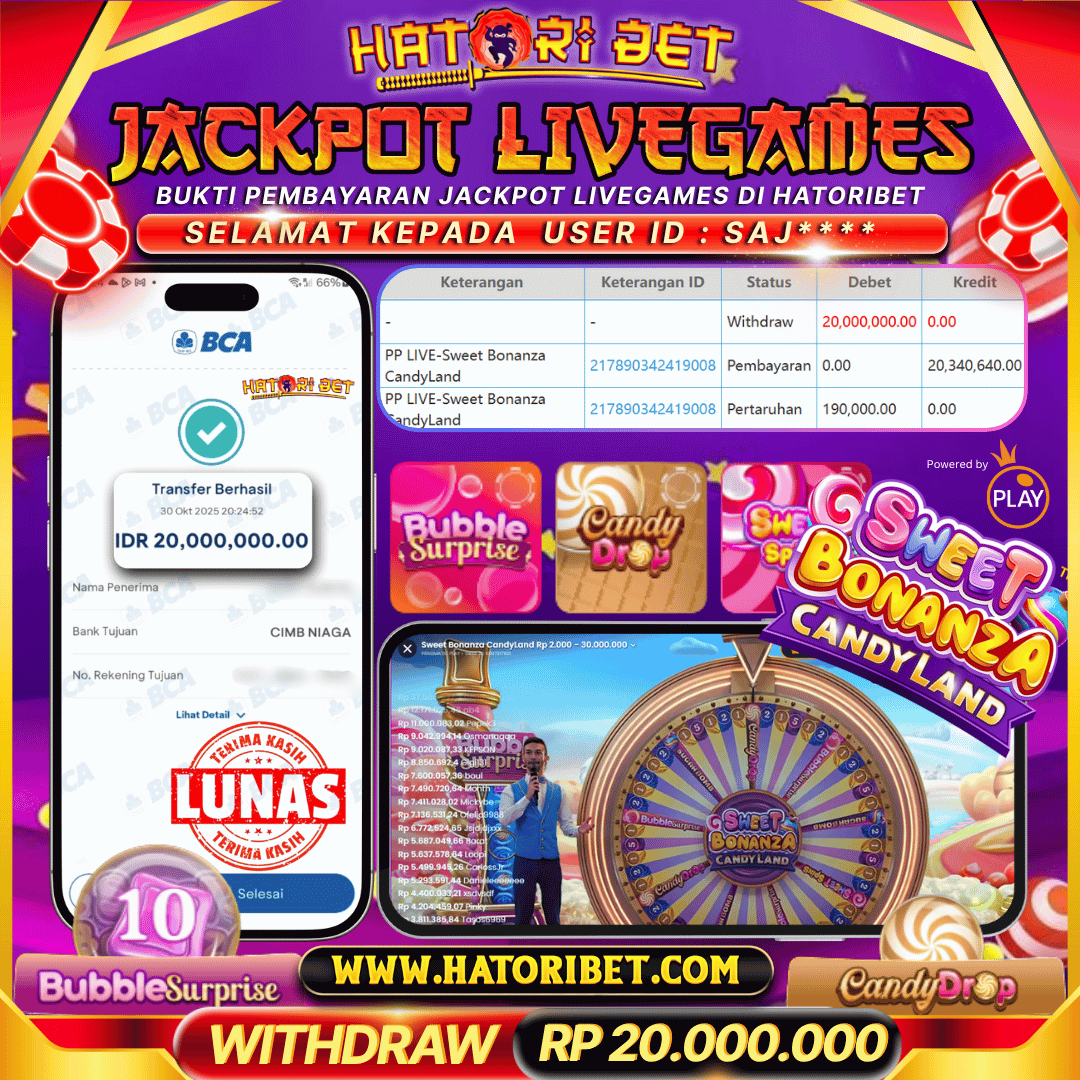 HATORIBET JACKPOT LIVEGAMES PP LIVE-SWEET BONANZA CANDYLAND RP 20,000,000 ,- LUNAS