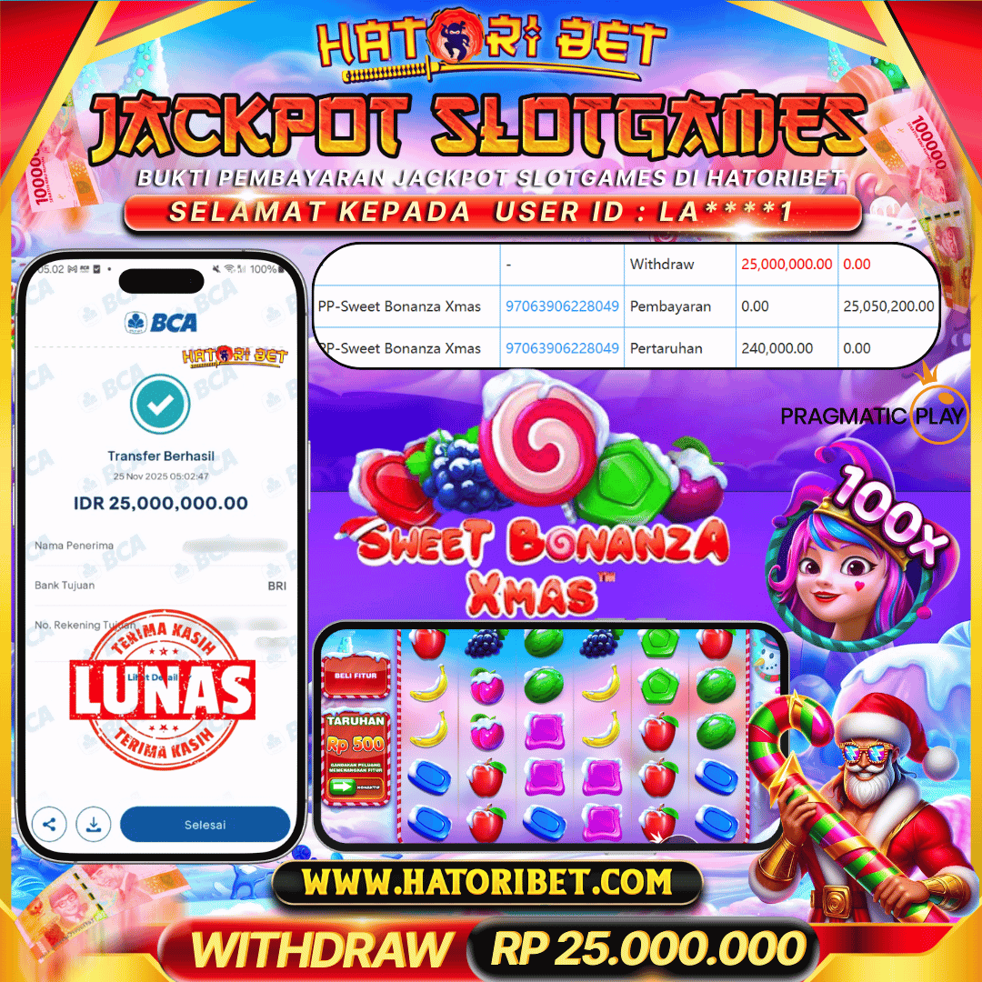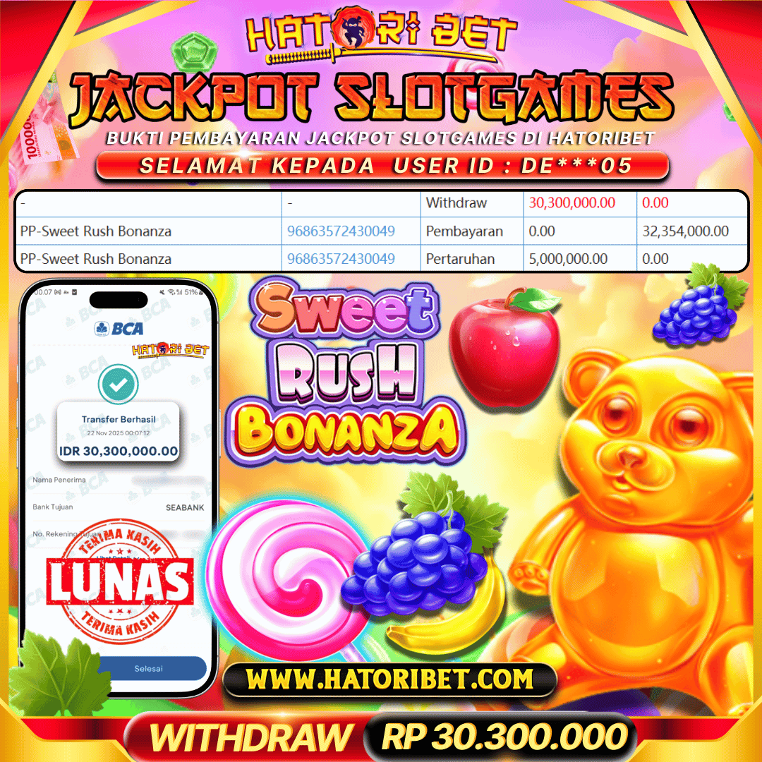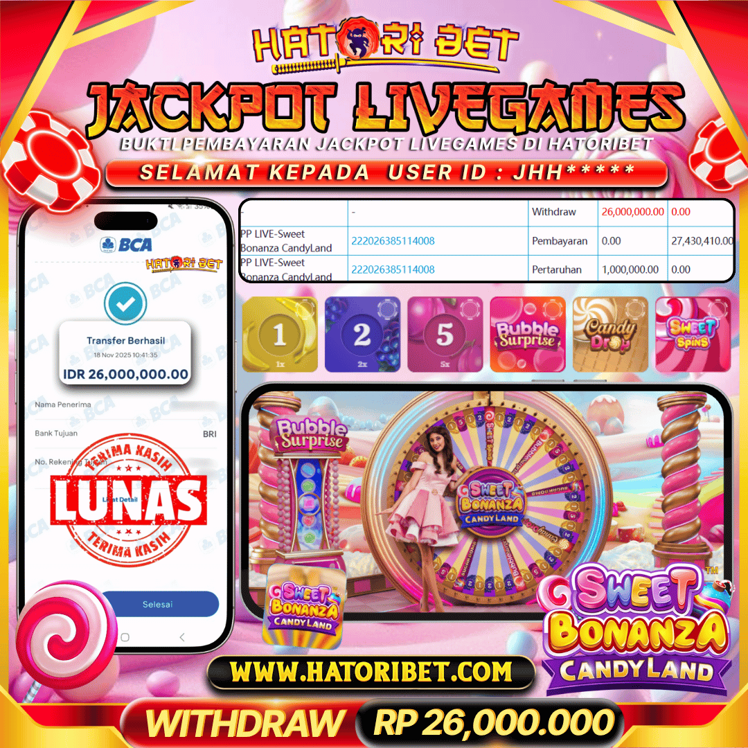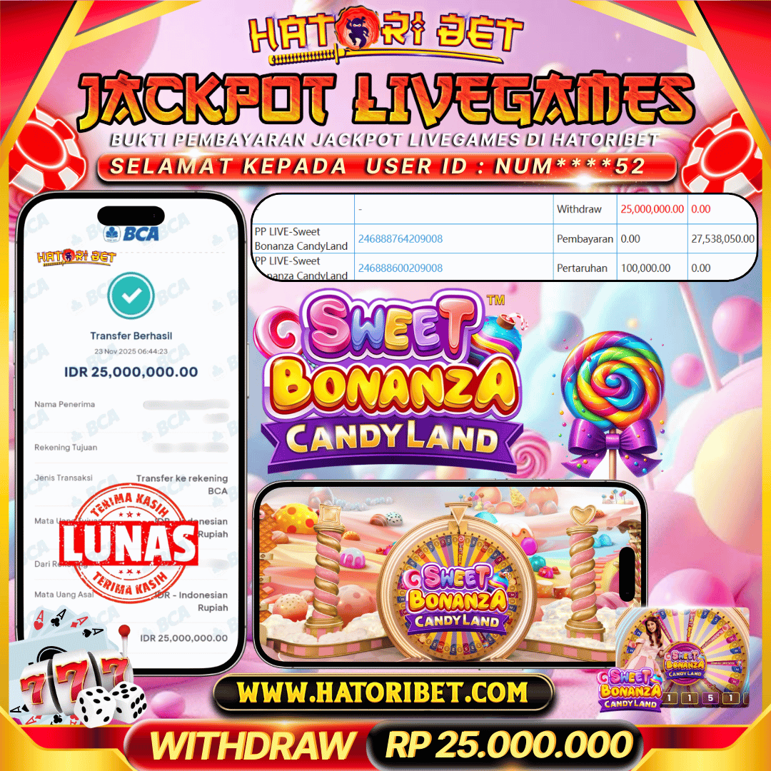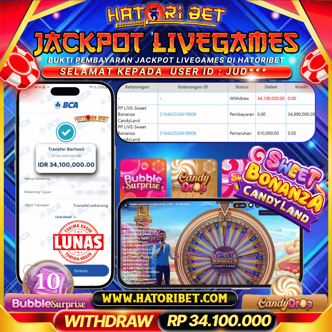 HATORIBET JACKPOT LIVEGAMES PP LIVE-SWEET BONANZA CANDYLAND RP 34,100,000 ,- LUNAS