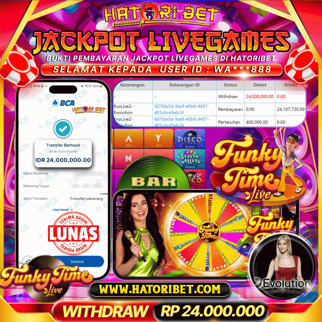 HATORIBET JACKPOT LIVEGAMES EVOLUTION LIVE-FUNKY TIME LIVE RP 24,000,000 ,- LUNAS