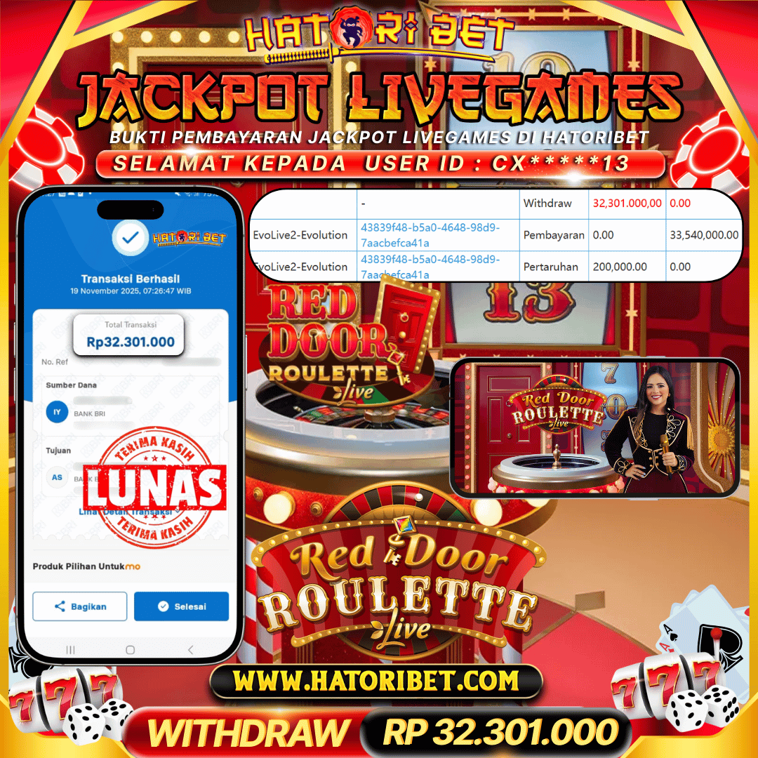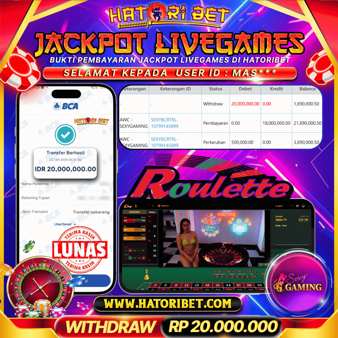 HATORIBET JACKPOT LIVEGAMES SEXY GAMING-ROULETTE 71 RP 20,000,000 ,- LUNAS