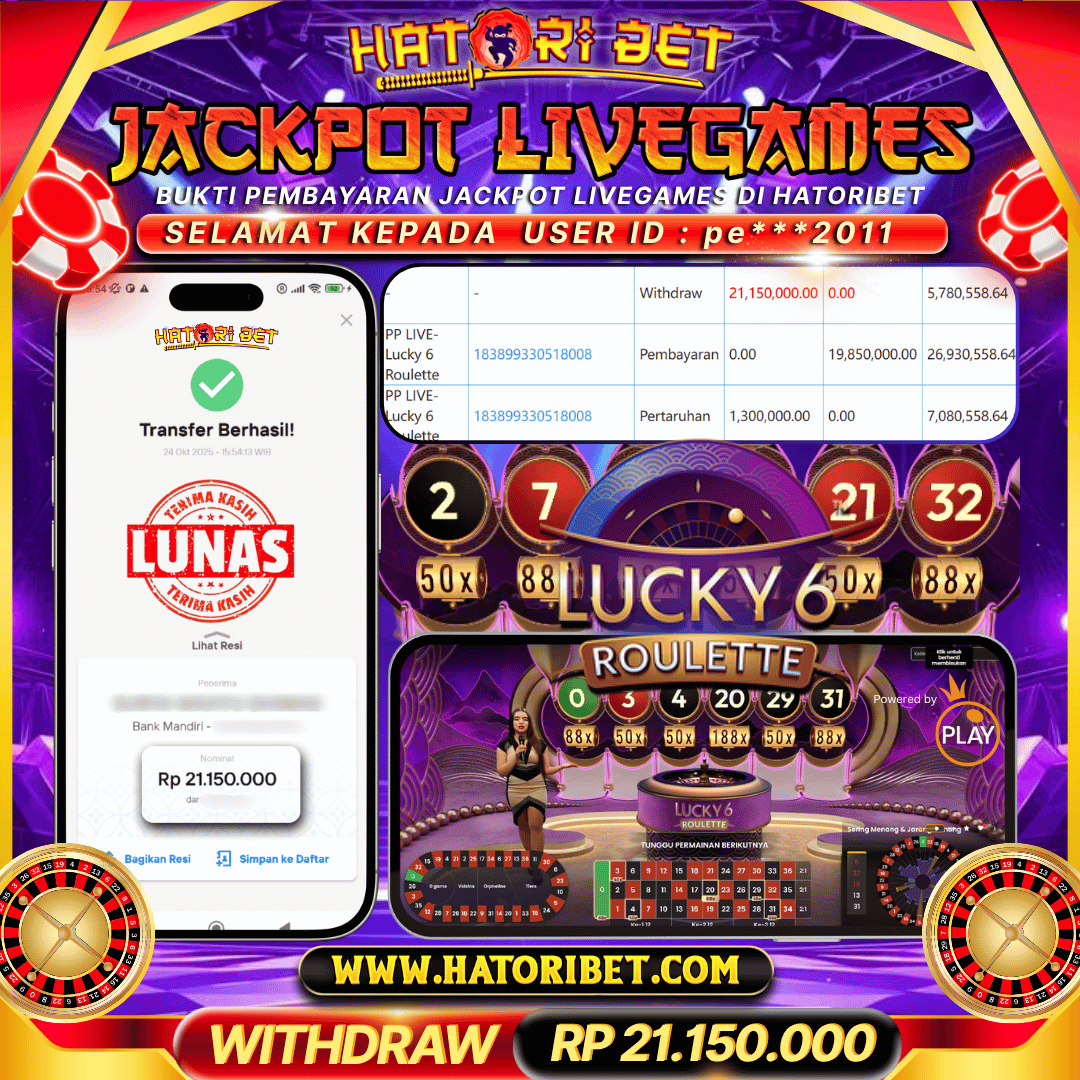 HATORIBET JACKPOT LIVEGAMES PP LIVE-LUCKY 6 ROULETTE RP 21,150,000 ,- LUNAS