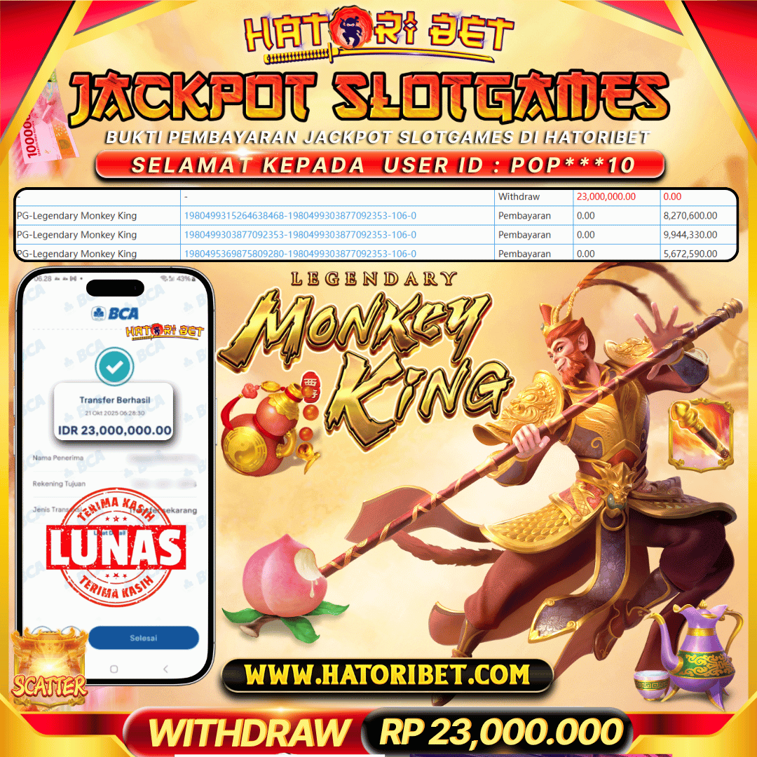 HATORIBET JACKPOT SLOTGAMES PG-LEGENDARY MONKEY KING 23,000,000 ,- LUNAS