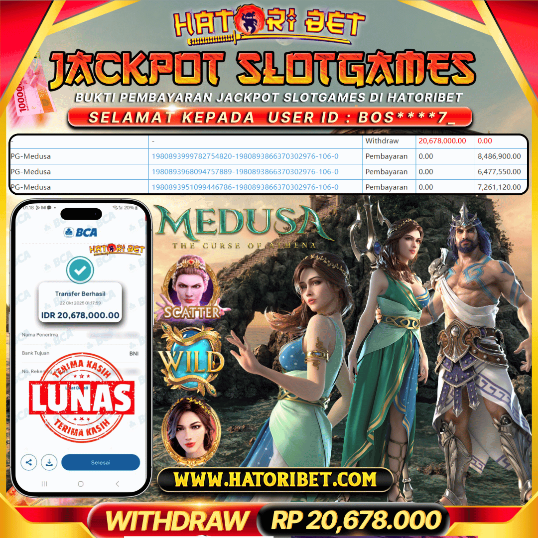 HATORIBET JACKPOT SLOTGAMES PG-MEDUSA 20,678,000 ,- LUNAS
