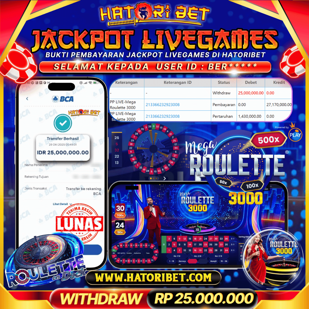HATORIBET JACKPOT LIVEGAMES PP LIVE-MEGA ROULETTE 3000 RP 25,000,000 ,- LUNAS