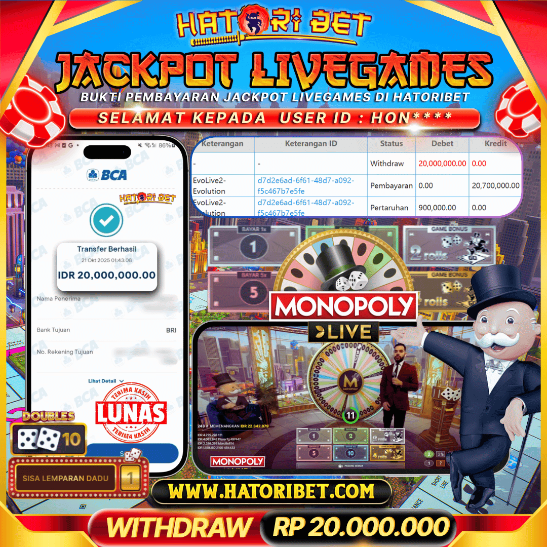 HATORIBET JACKPOT LIVEGAMES EVOLUTION LIVE-MONOPOLY RP 20,000,000 ,- LUNAS