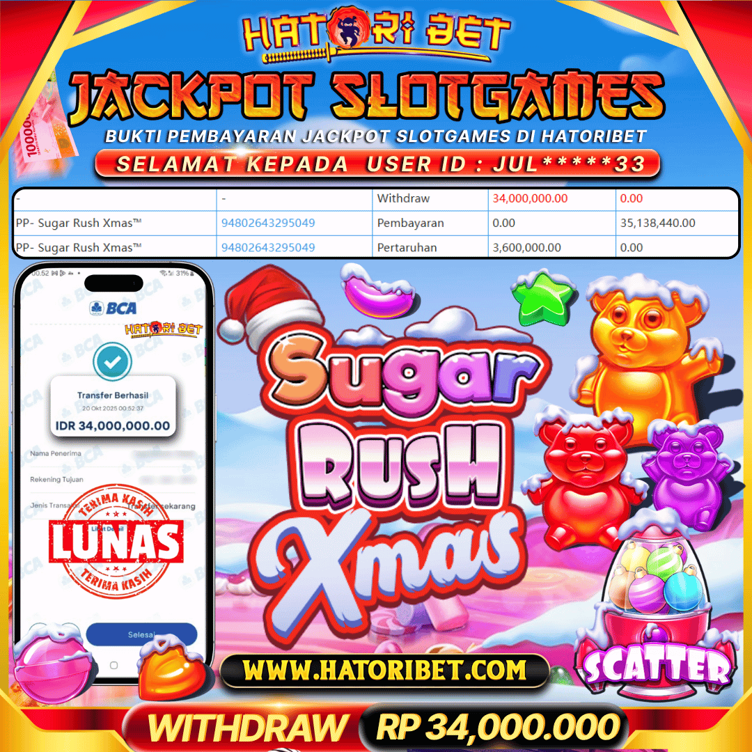 HATORIBET JACKPOT SLOTGAMES PP-SUGAR RUSH XMAS 34,000,000 ,- LUNAS