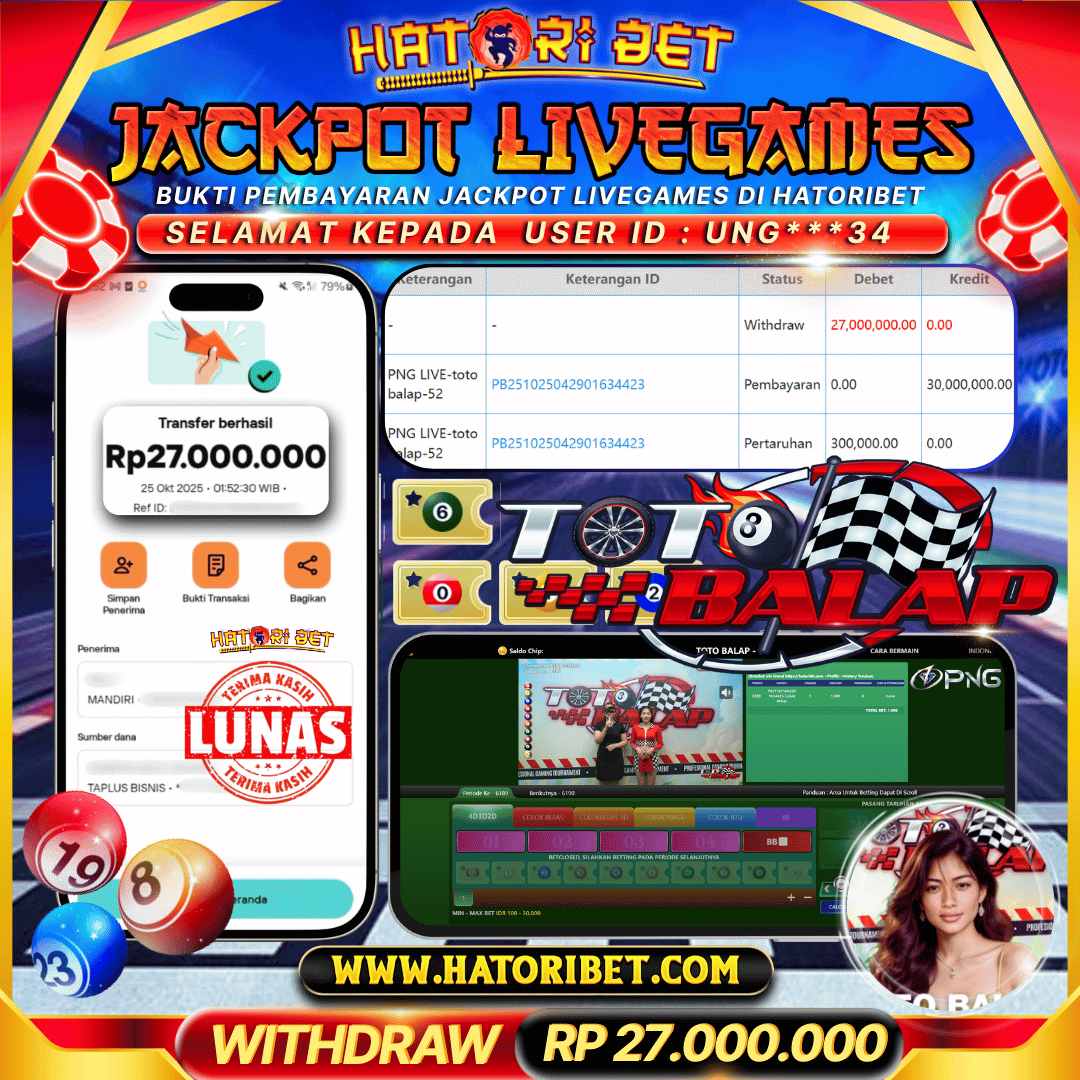 HATORIBET JACKPOT LIVEGAMES PNG LIVE-TOTO BALAP 52 RP 27,000,000 ,- LUNAS