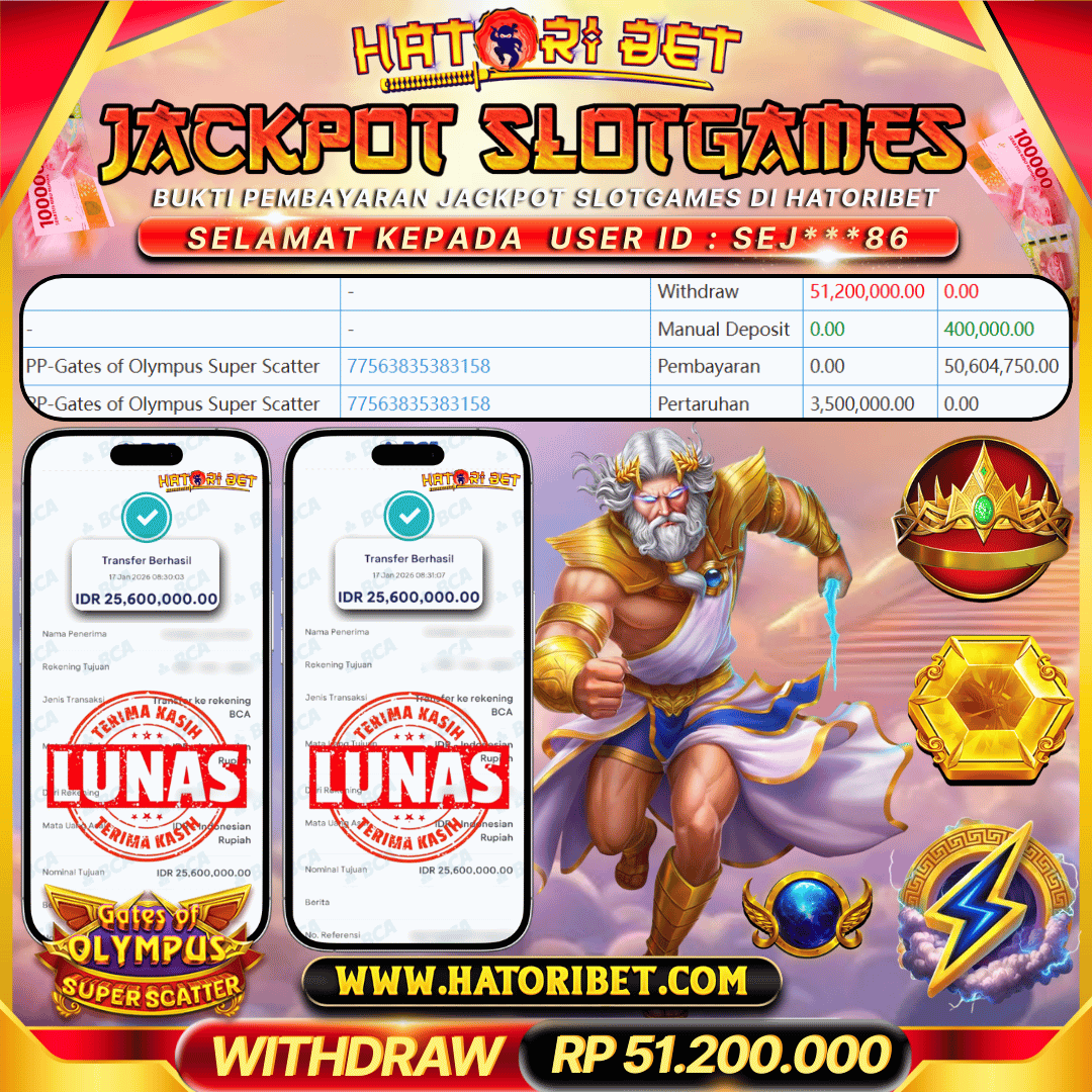 Selamat kepada UserId : SEJ***86 telah berhasil mendapatkan kemenangan besar pada permainan SLOTGAMES PP- GATES OF OLYMPUS SUPER SCATTER sebesar RP 51,200,000 , Setelah mengisi formulir withdraw dalam kurung waktu hanya 5 – 10 menit pihak HatoriBet sudah melakukan transfer kepada pemilik UserId dan dana sudah dapat di cairkan oleh pemenang. Bukti pembayaran yang kami berikan merupakan bukti pembayaran yang SAH / VALID yang langsung di dapatkan melaui tanda transfer transaksi dari Bank yang di tuju. Kami mengucapakan banyak Terima Kasih Kepada pemenang karena sudah mempercayakan kami sebagai Bandar terpercaya yang membayar semua kemenangan member hingga lunas. Masih ragu dengan HatoriBet? Di mana bandar slot dan togel online sekarang yang terpercaya seperti hatoribet ? Bandar yang mengirimkan kemenangan member tanpa bertele – tele. Jadi.... tidak perlu khawatir pada situs HATORIBET karena kemenangan berapapun akan dibayarkan hingga lunas kepada pemenang