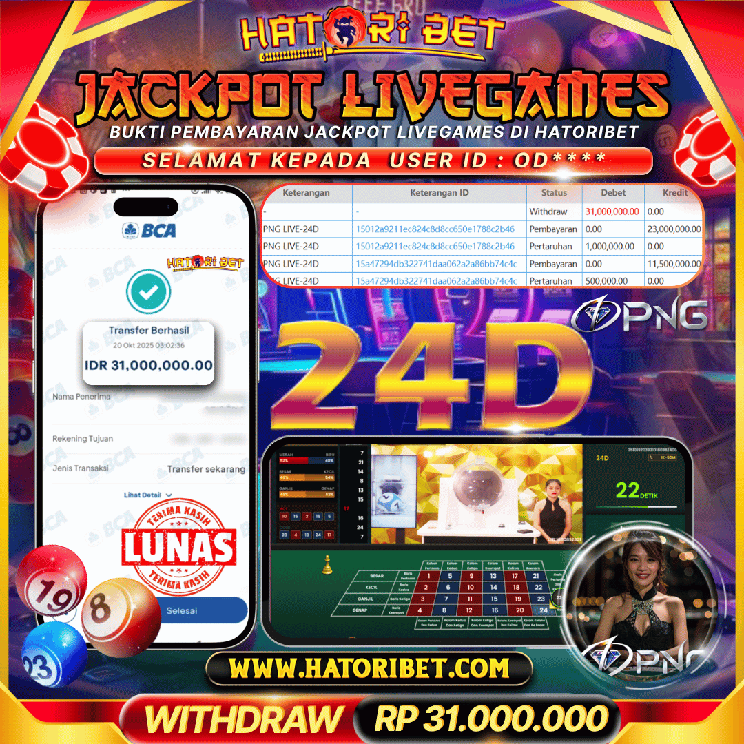 HATORIBET JACKPOT LIVEGAMES PNG LIVE-24 D RP 31,000,000 ,- LUNAS