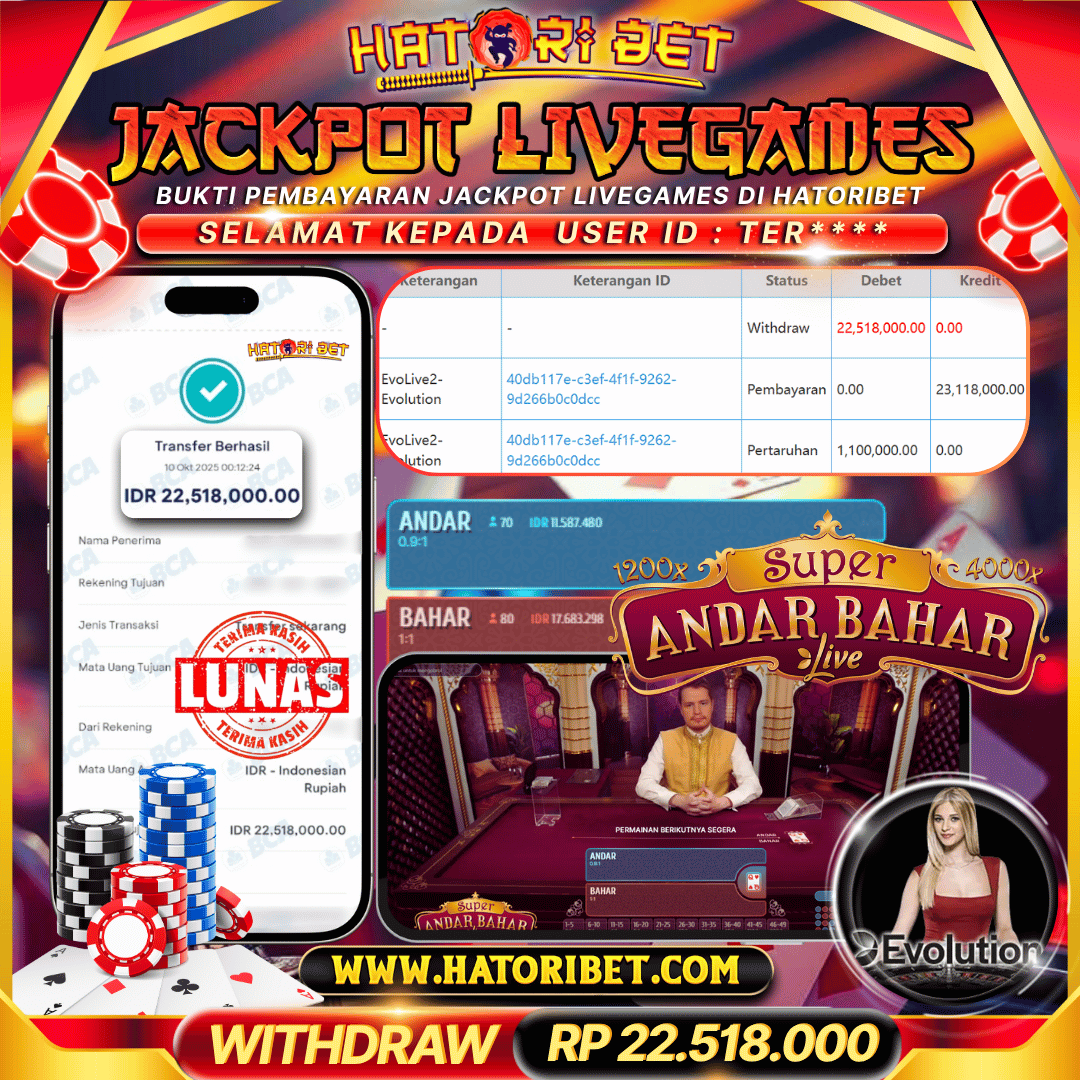 HATORIBET JACKPOT LIVEGAMES EVOLUTION LIVE-SUPER ANDAR BAHAR RP 22,518,000 ,- LUNAS