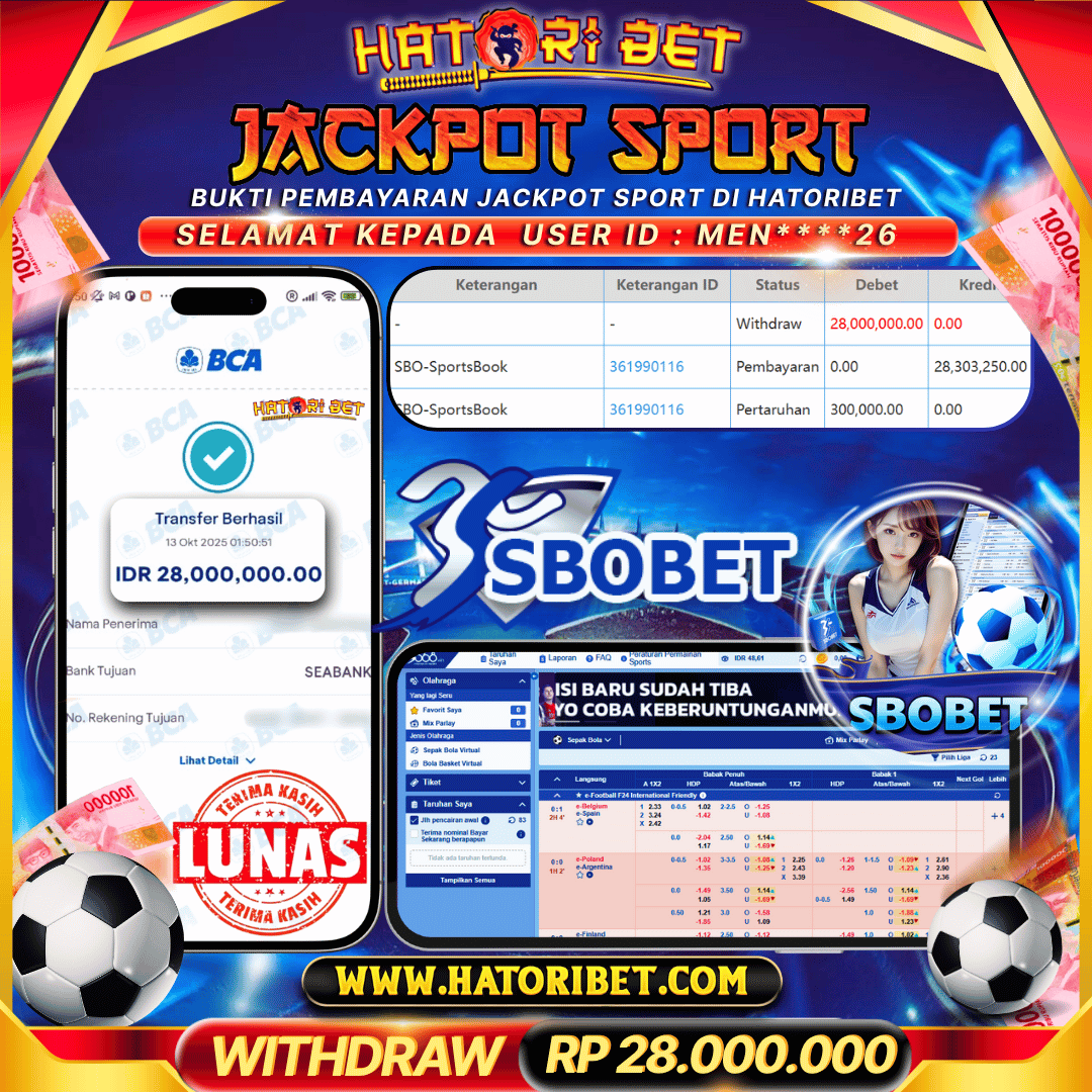 HATORIBET JACKPOT SPORT SBOBET RP 28,000,000 ,- LUNAS