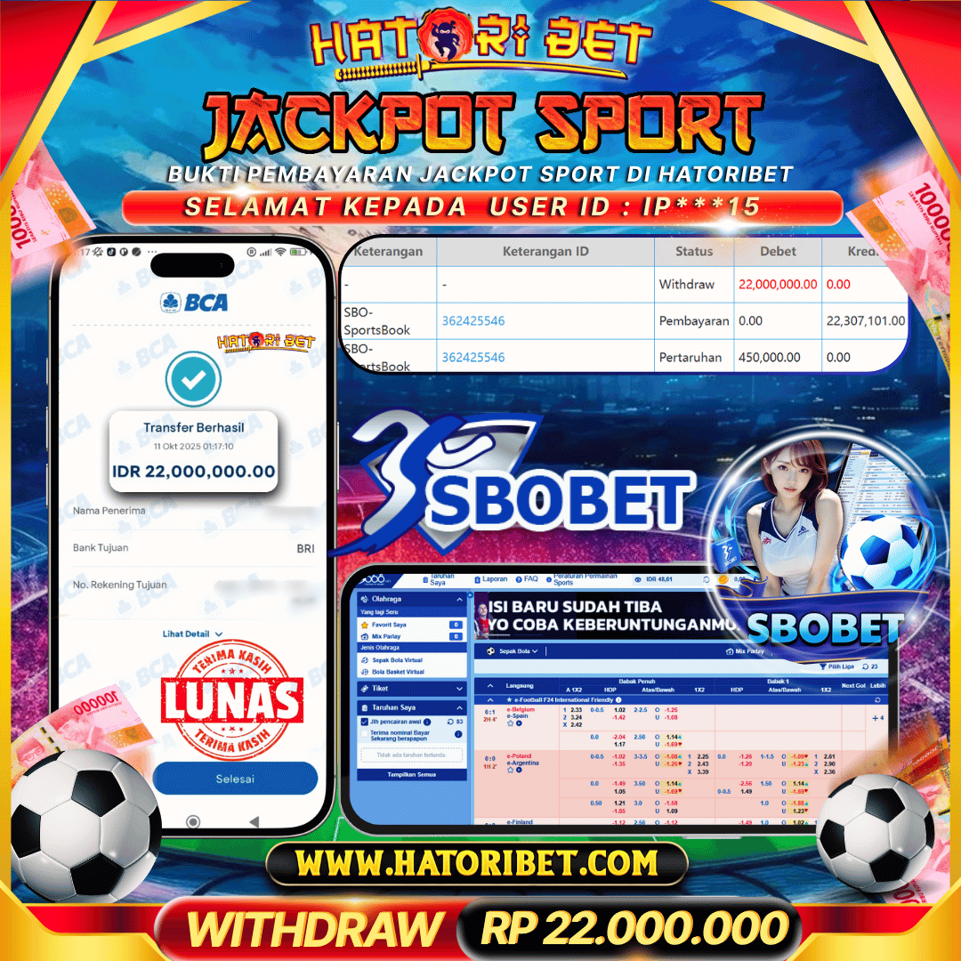 HATORIBET JACKPOT SPORT SBOBET RP 22,000,000 ,- LUNAS