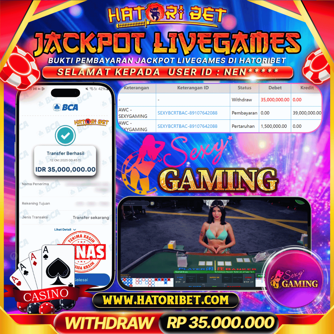 HATORIBET JACKPOT LIVEGAMES SEXY GAMING-BACCARAT 01 RP 35,000,000 ,- LUNAS
