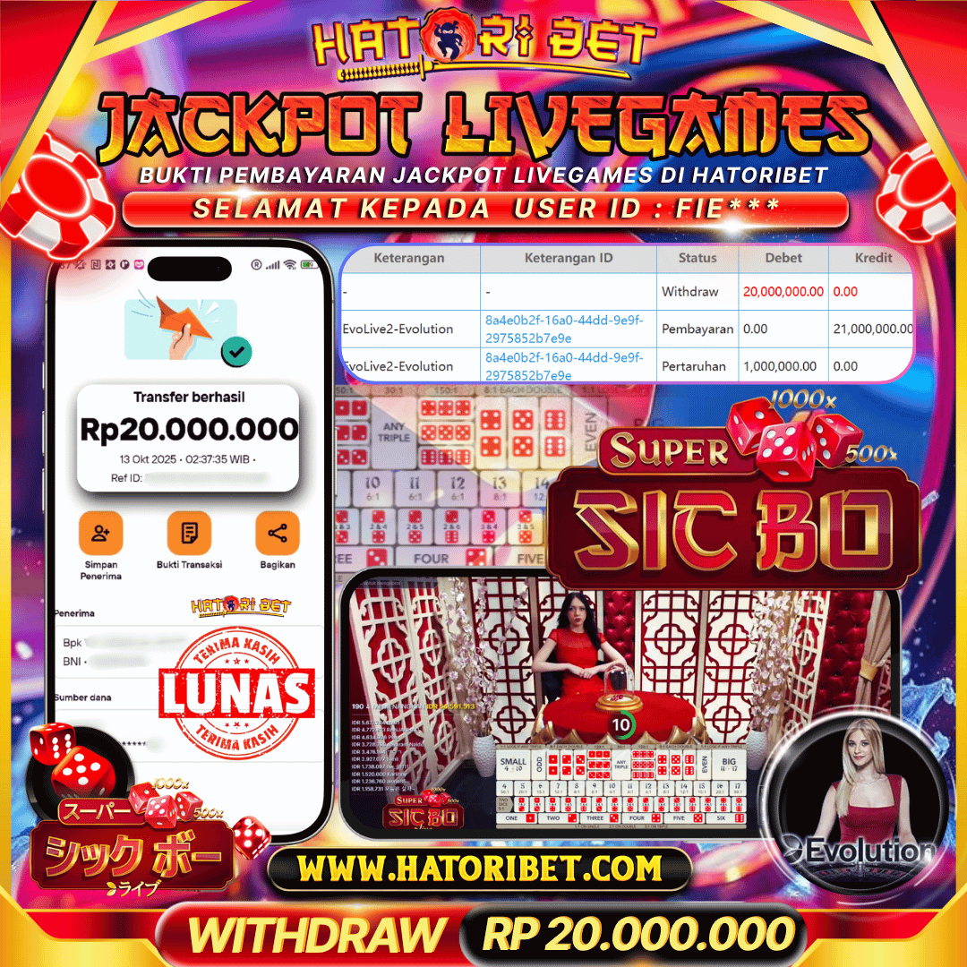 HATORIBET JACKPOT LIVEGAMES EVOLUTION LIVE-SUPER SIC BO RP 20,000,000 ,- LUNAS